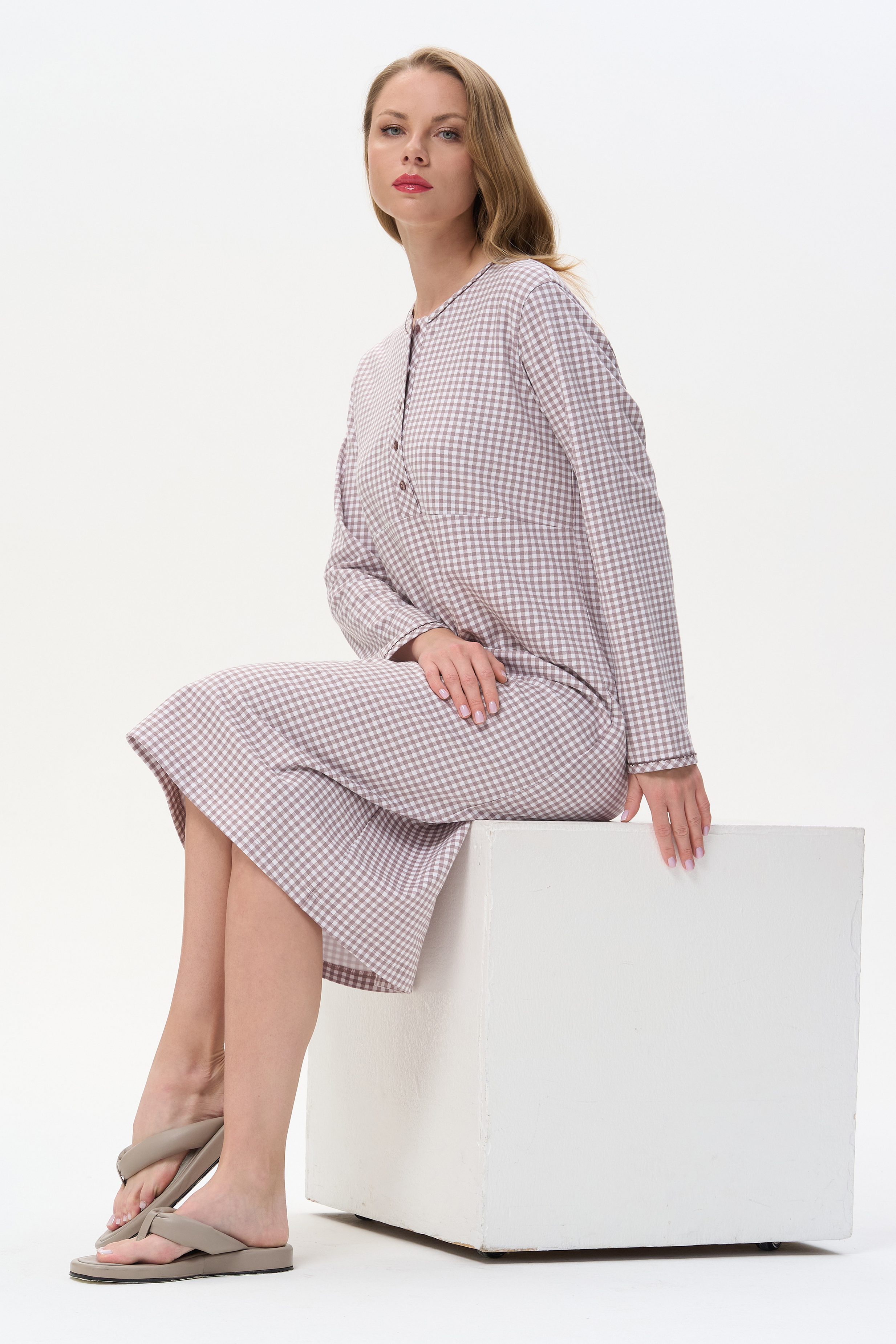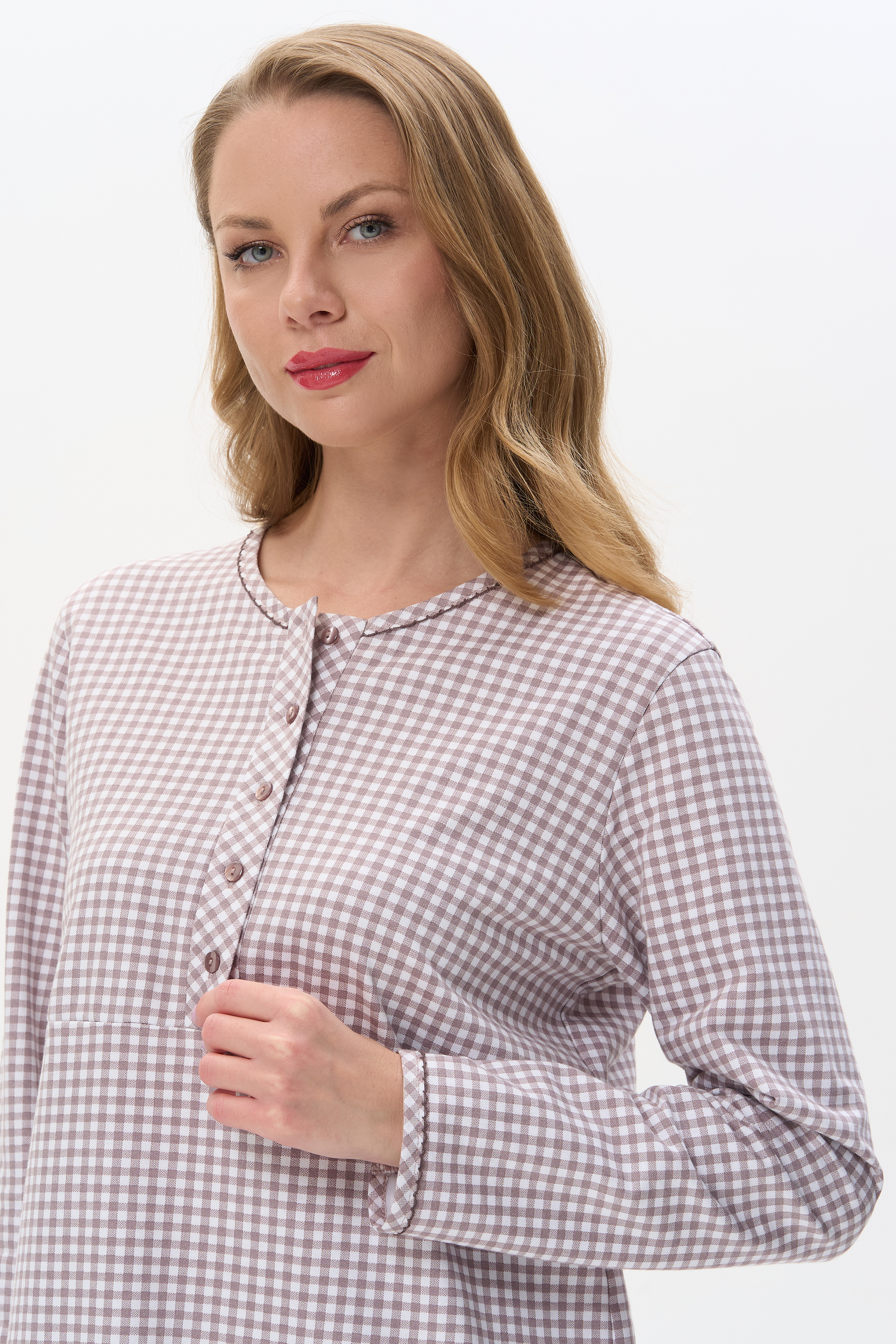 Ночная сорочка из футера 2х-нитки с начесом. Удлиненная планка с застёжкой на пуговицы. Длинные втачные рукава. Рост модели на фото 175 см.