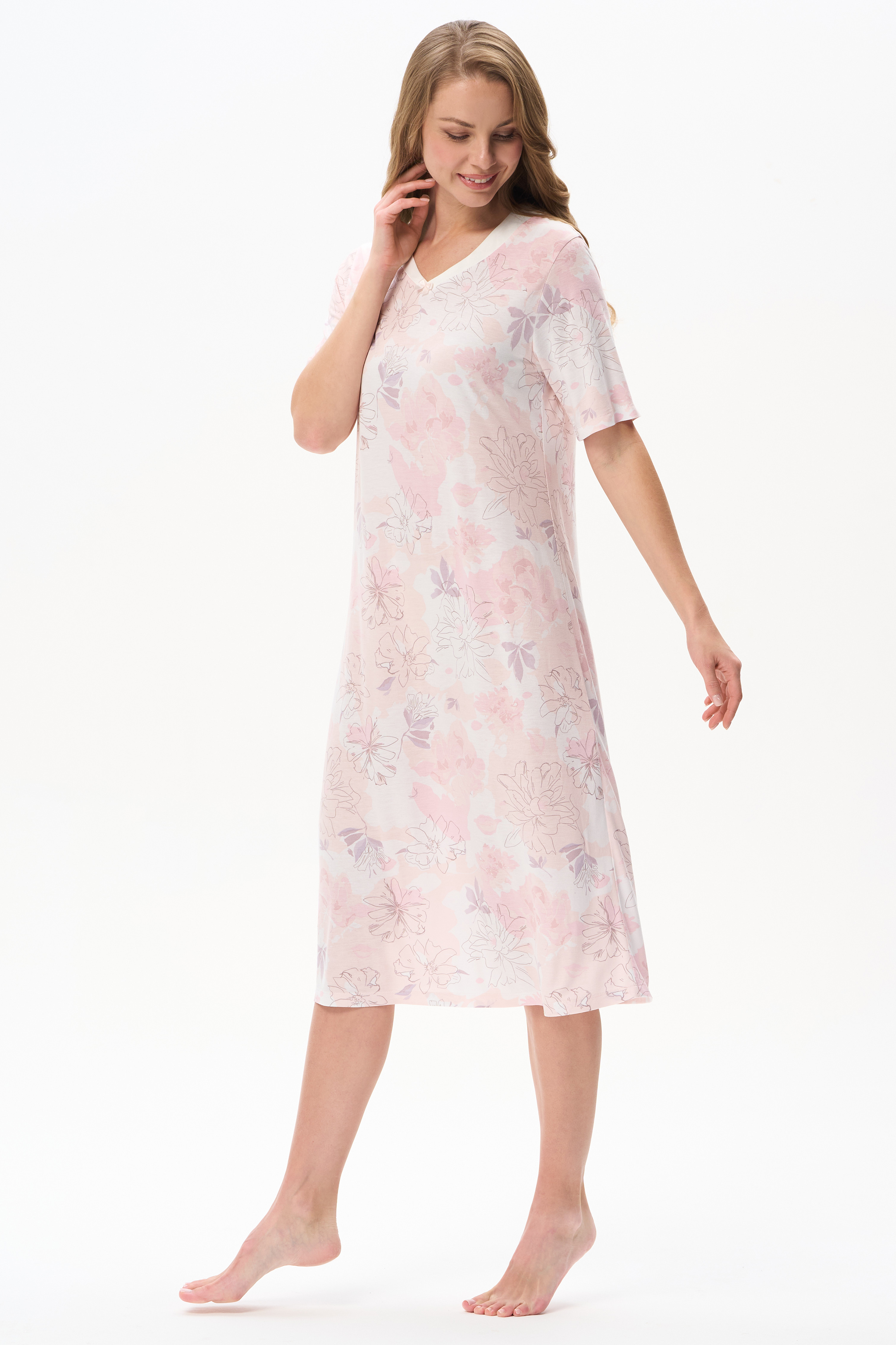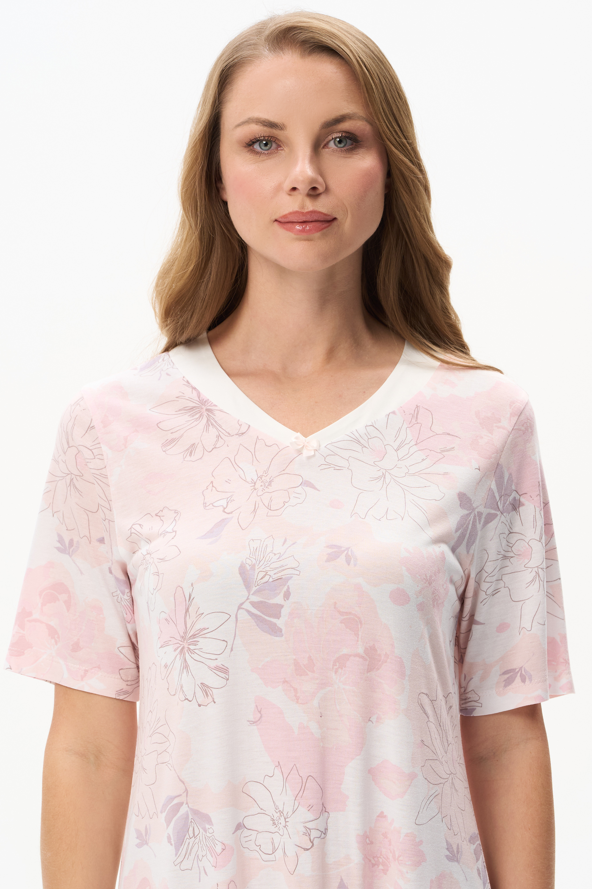 100% вискоза Сорочка из вискозы качества вортекс мягкая, шелковистая, 160 гр. Дизайнерский рисунок в стиле LORY - Акварельный цветочный принт с тонкими изящными линиями в нежных розовых тонах и оттенке мокко. Модель свободного кроя, длиной ниже колен, V-образный вырез с атласной отделкой и бантиком добавляют эксклюзивности и утончённости модели. Длина изделия и рукава - пропорции проверенные временем. Рост модели 175 см