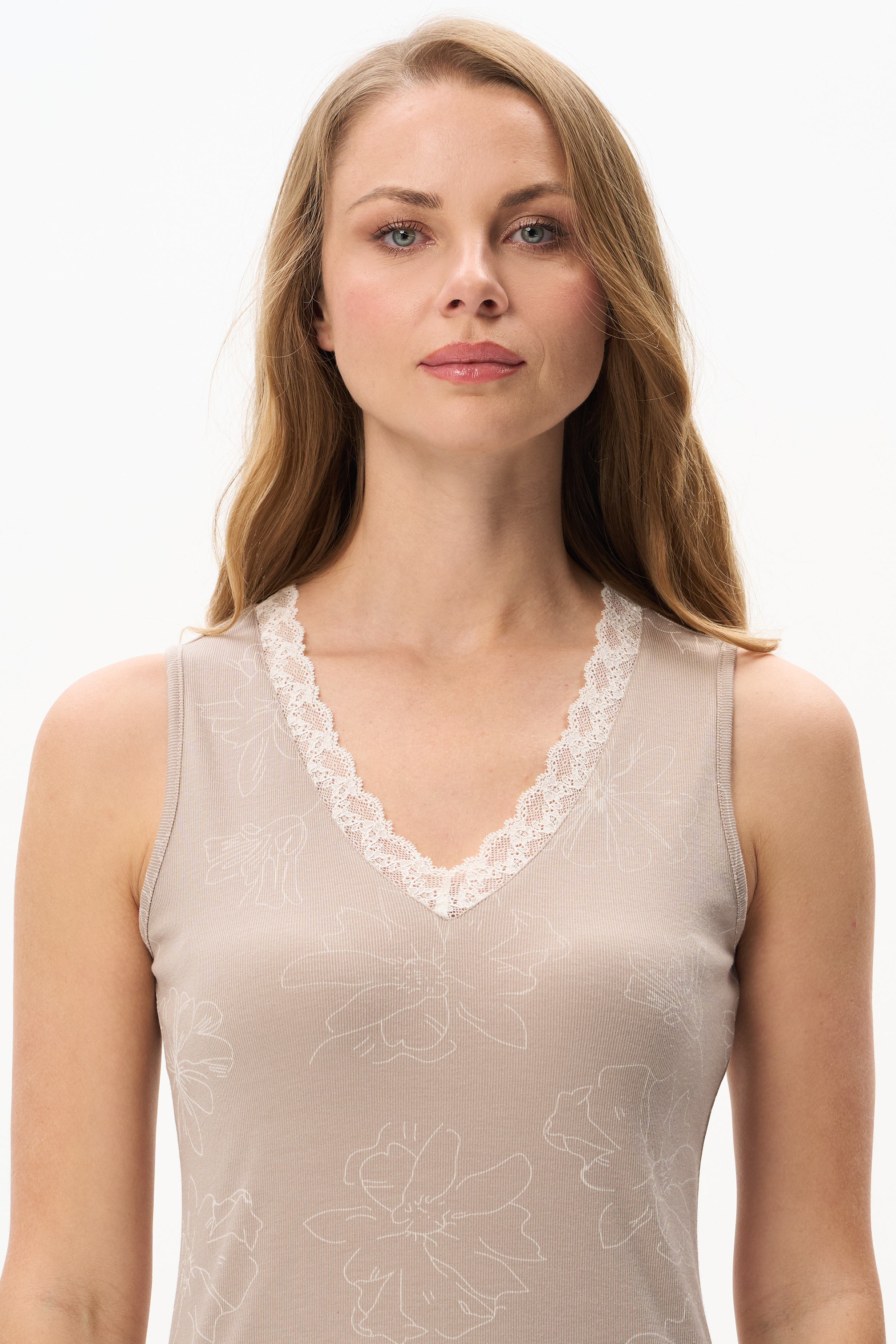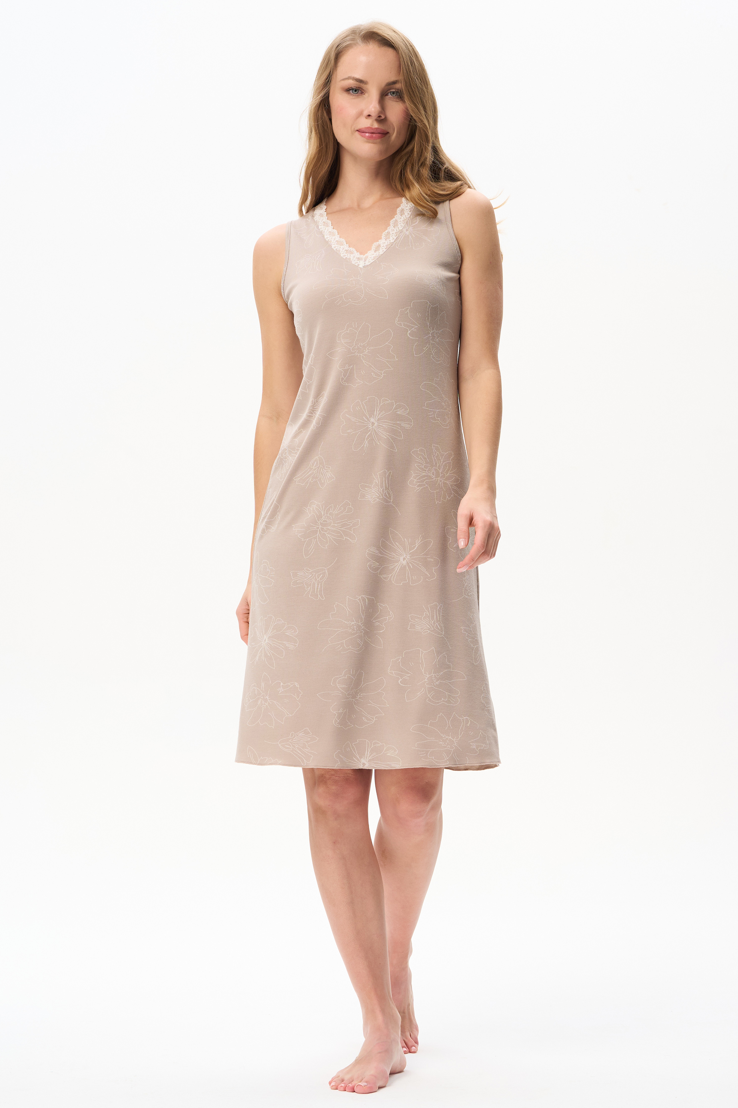 85% вискоза/ 15% полиэстер Сорочка из полотна вискозной мелисы - мягкая, шелковистая, фактурная 160 гр. Рисунок - тонкие, изящные цветы молочного оттенка на фоне мокко. V-образный вырез украшен нежным кружевом, по проймам тонкая бейка, длина до колен. Дизайн сорочки отличается изысканным сочетанием классического кроя и современных акцентов. Рост модели 175 см
