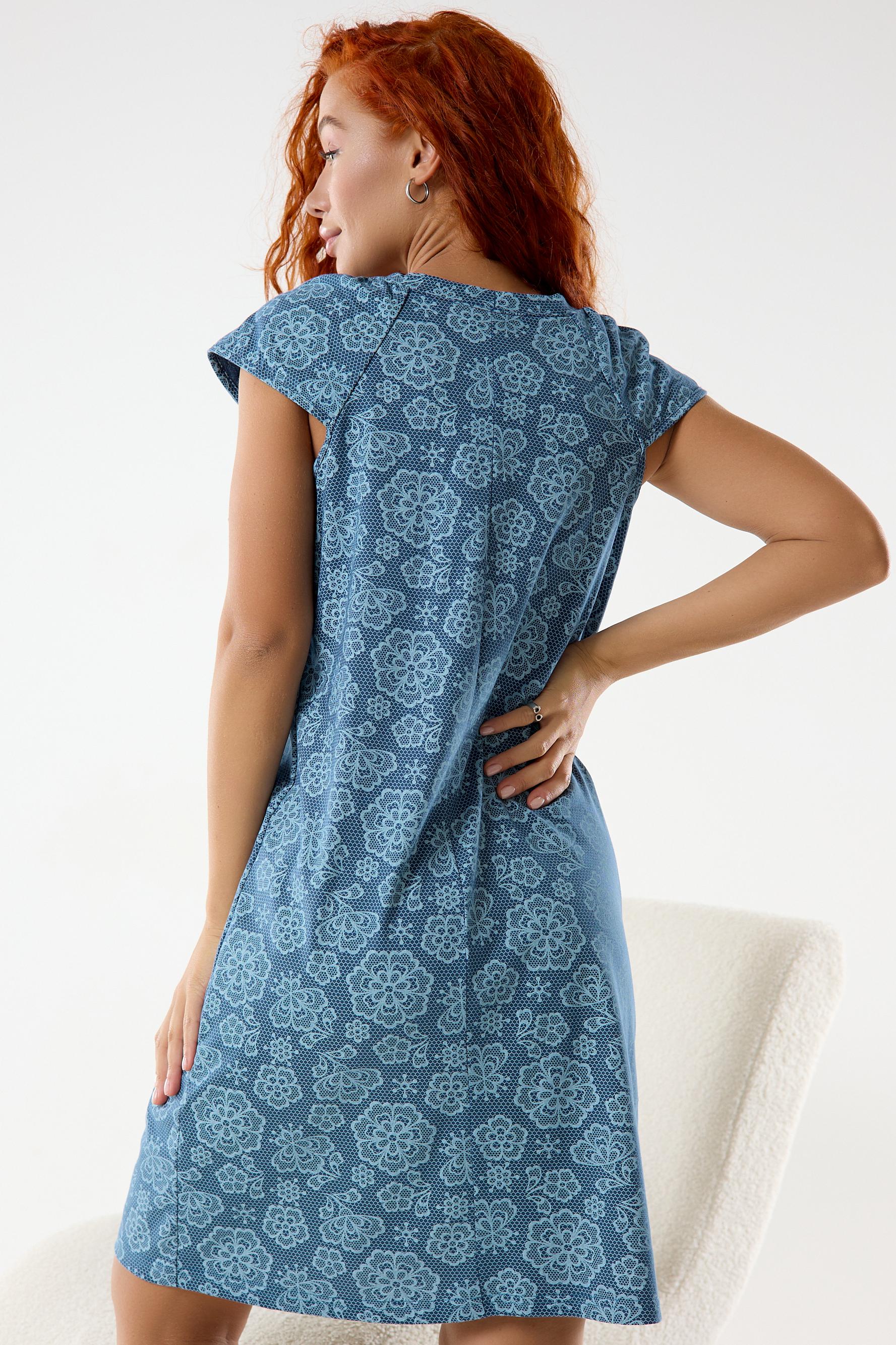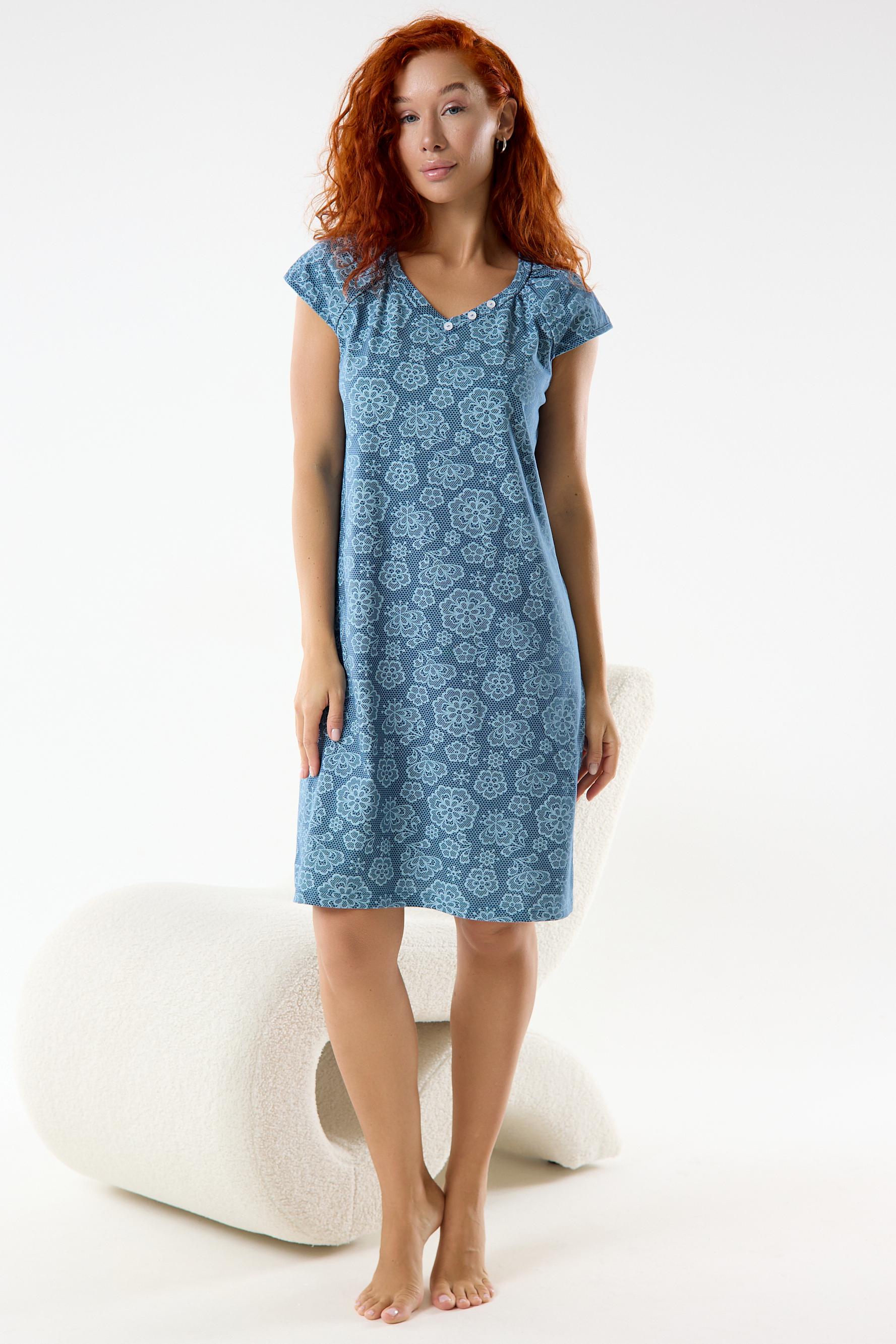 Женская ночная сорочка прямого кроя из качественного хлопкового полотна. Состав ткани и крой сорочки окунут вас в комфортный и сладкий сон. Сорочка с коротким рукавом – реглан. Красивый V-образный вырез горловины с декоративными пуговицами. Длина сорочки до коленей. Полочку украшает крупный принт в виде цветов.