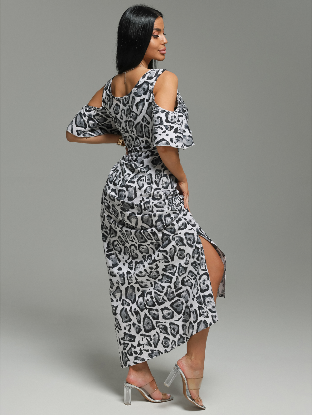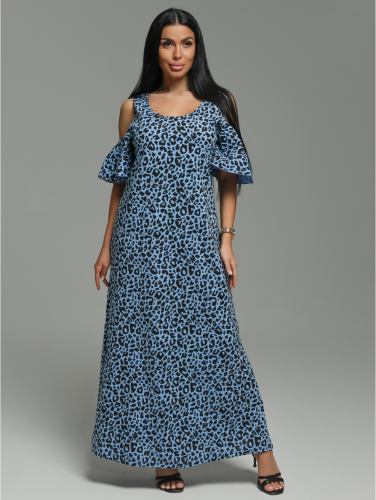 Длинное с разрезами по бокам платье в форме трапеции дополняет рукав-волан с открытым плечом.