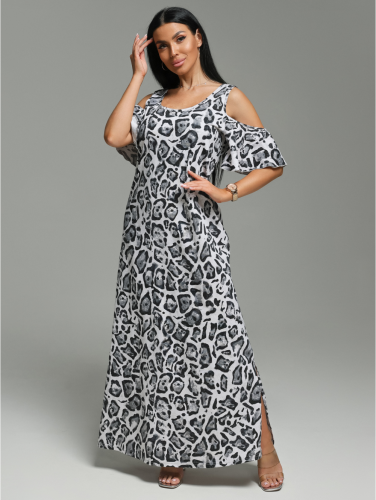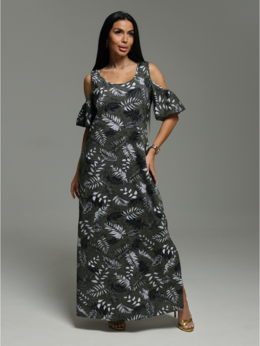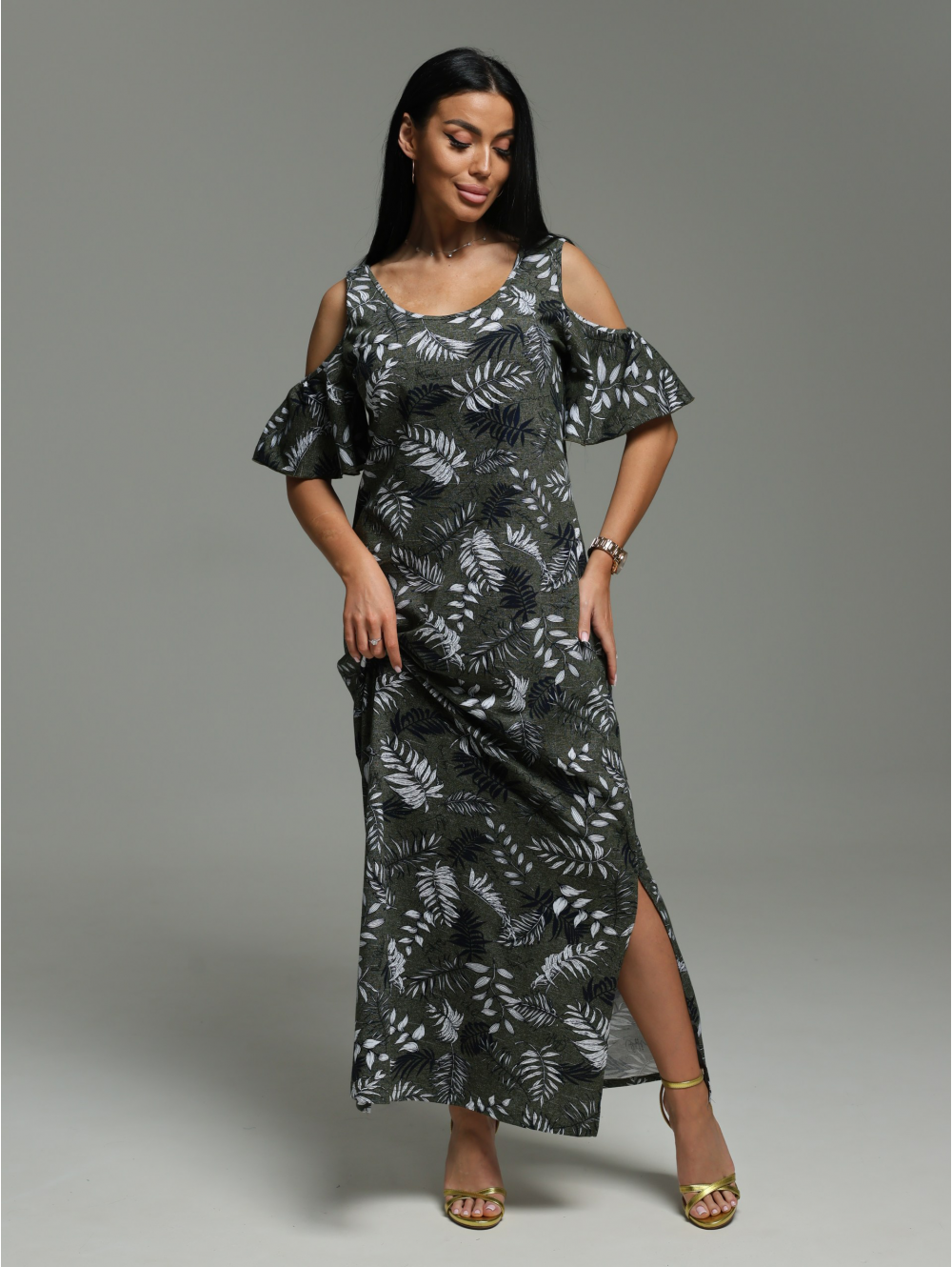 Длинное с разрезами по бокам платье в форме трапеции дополняет рукав-волан с открытым плечом.
