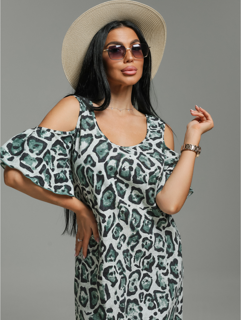 Длинное с разрезами по бокам платье в форме трапеции дополняет рукав-волан с открытым плечом.