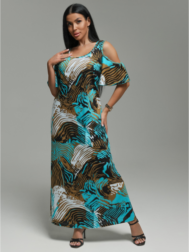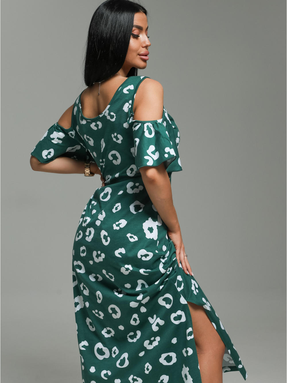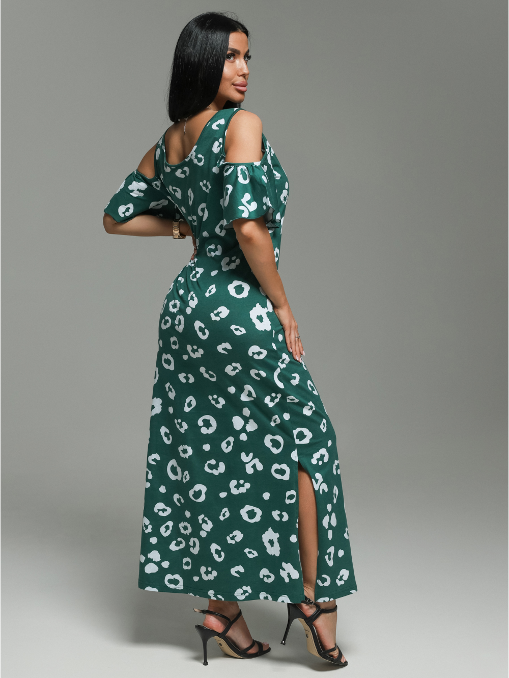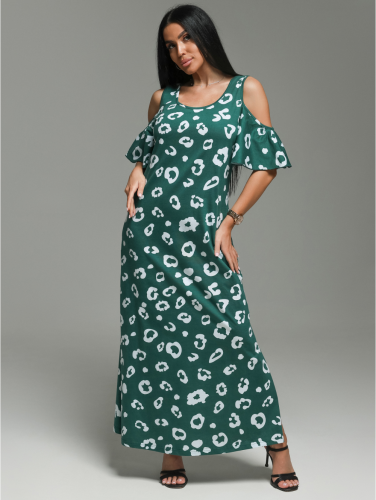 Длинное с разрезами по бокам платье в форме трапеции дополняет рукав-волан с открытым плечом.