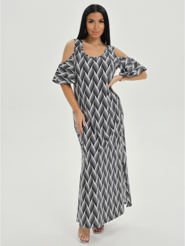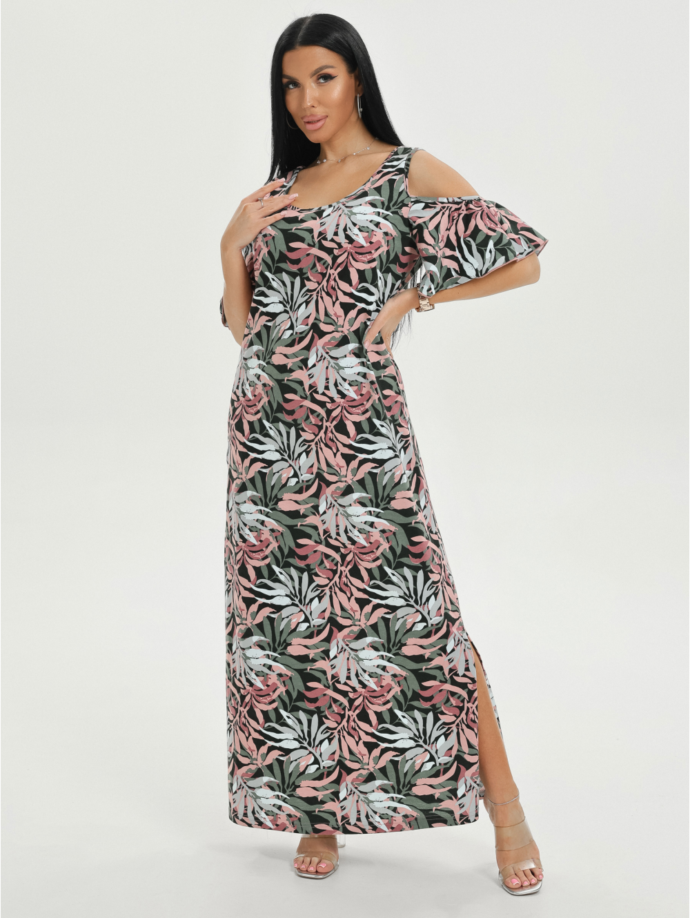 Длинное с разрезами по бокам платье в форме трапеции дополняет рукав-волан с открытым плечом.
