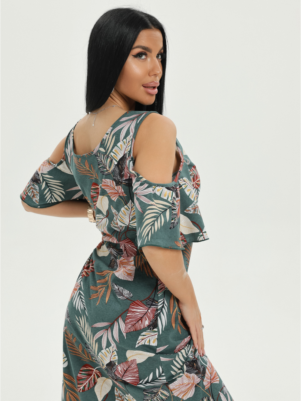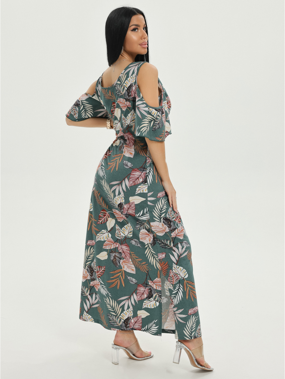 Длинное с разрезами по бокам платье в форме трапеции дополняет рукав-волан с открытым плечом.