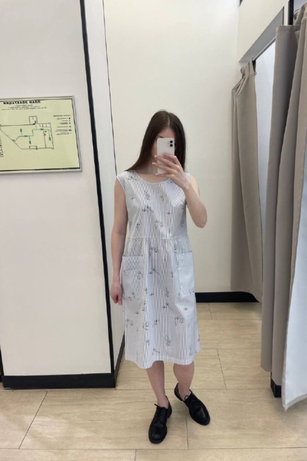 Платье свободного силуэта из плательной ткани. Изделие отрезное по линии талии, со сборкой на юбке, которая украшена накладными карманами. Круглый вырез горловины и линия проймы оформлены косыми бейками из основной ткани.