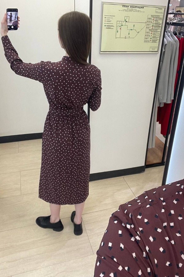 Платье свободного силуэта из плательной ткани. Изделие отрезное по линии талии с резинкой. Лиф платья с запахом, фиксируется на пуговицу для удобства. На передней части юбки выполнена складка, имитирующая запах, в боковых швах карманы. Линия горловины оформлена воротником-стойкой. Втачной длинный рукав с манжетой, застегивающейся на пуговицы. В комплекте пояс из основной ткани.