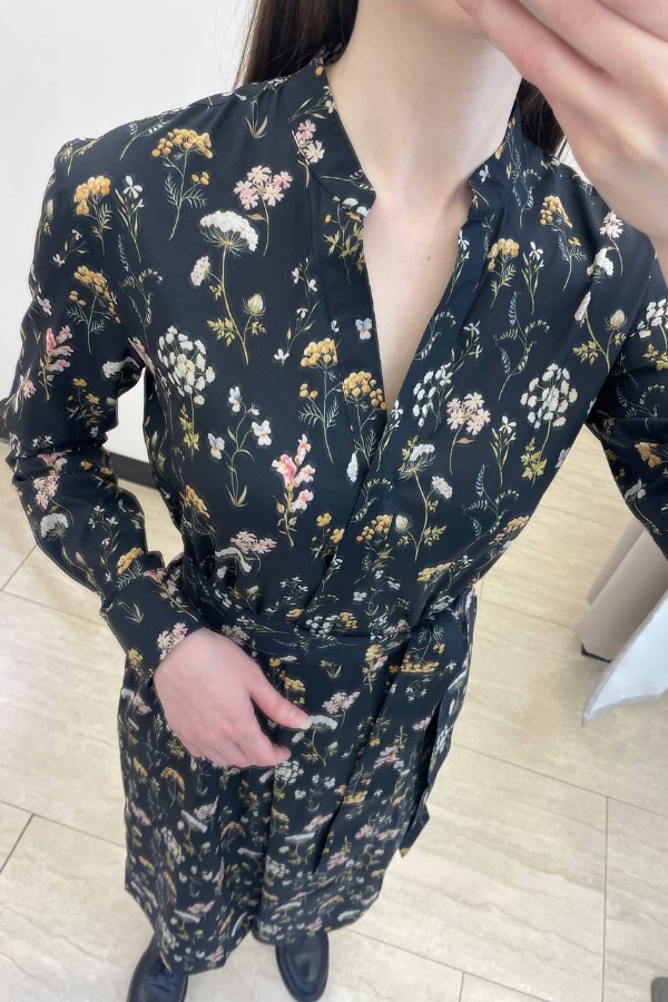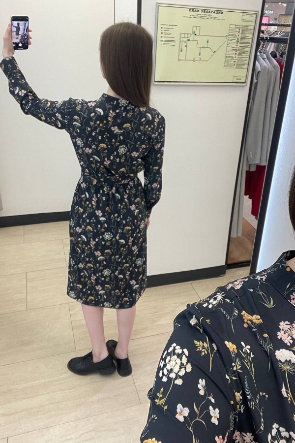 Платье свободного силуэта, расширенное книзу из вискозной плательной ткани. Низ изделия асимметричной длины (спинка чуть удлинена относительно переда). V-образный вырез горловины с декоративной завязкой. Втачной рукав со сборкой по окату и низу рукава. Асимметричный низ рукава и вырез горловины окантованы косыми бейками. В комплекте пояс из основной ткани.