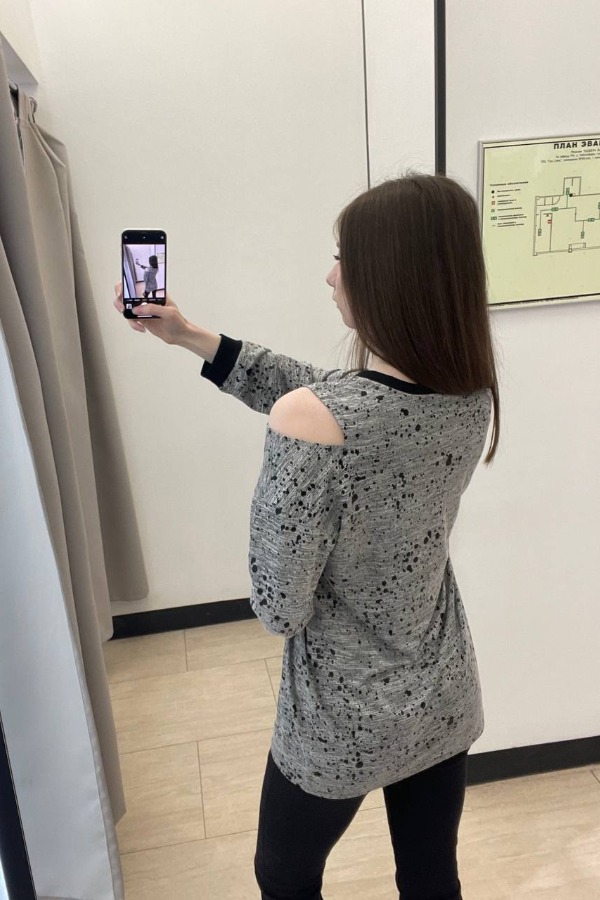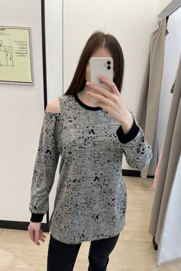 Джемпер прилегающего силуэта из меланжевого эластичного полотна с оригинальным накатом в виде капель. Круглый вырез горловины. Втачной длинный рукав. На одном из рукавов вырез на плече. Линия горловины и низ рукава оформлены эластичным полотном в рубчик.