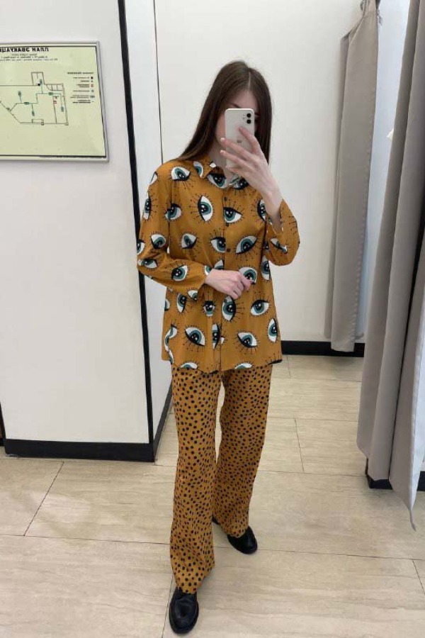 Летний костюм из вискозной ткани компаньонов. Рубашка свободного силуэта с разрезами в боковых швах и застёжкой на пуговицы. Рубашечный длинный рукав. Вырез горловины обработан отложным воротником на стойке. На задней части изделия выполнена кокетка с небольшой складкой. Брюки прямого силуэта. Пояс притачной с эластичной резиной, в боковых швах карманы. Легкий, свободный, очень удобный и комфортный к телу костюм.