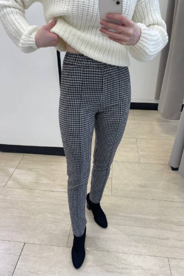 Брюки прямого силуэта, зауженные книзу из костюмной ткани. На передней части брюк застрочены стрелки. Пояс притачной с эластичной резиной.