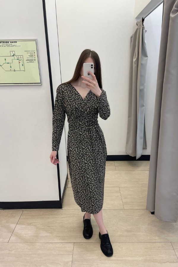Платье отрезное по линии талии из эластичного полотна. Изделие свободное в верхней части и полуприлегающее в области талии и бёдер. Глубокий V-образный вырез горловины плавно переходит в запах, фиксируется притачным поясом. Рукав оригинального кроя в стиле кимоно. В таблице размеров представлены параметры человека, а не изделия.
