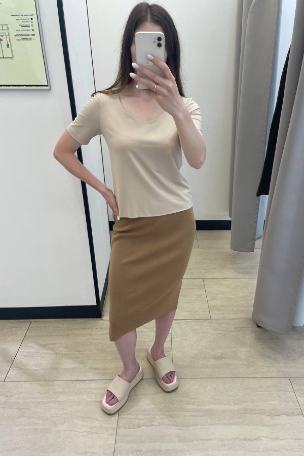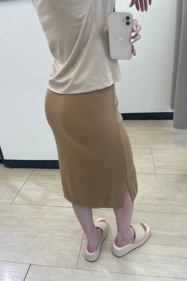 Юбка прилегающего силуэта с эластичным поясом и разрезом в боковом шве. Изделие выполнено из мягкой структурированной пряжи.