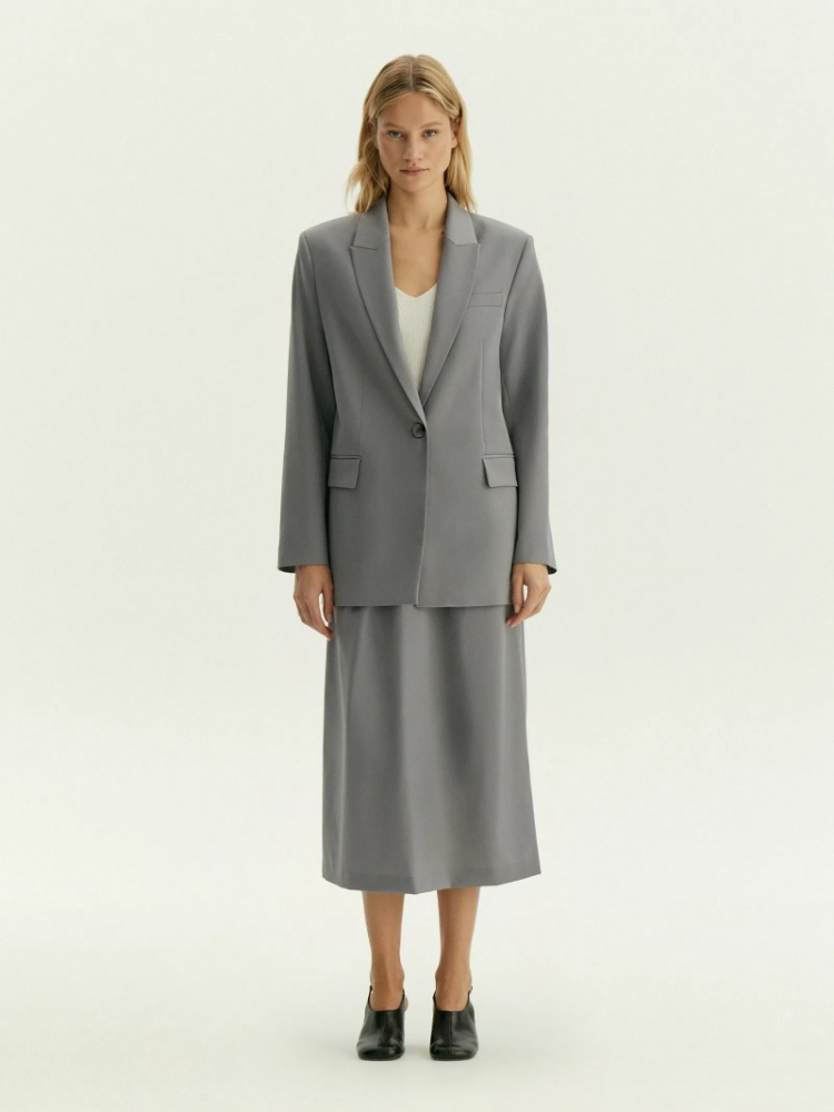Универсальный, стильный и практичный жакет в сером цвете. Материал на четверть состоит из шерсти, сделан с добавлением эластана для лучшей посадки. Удлинённая модель прямого кроя дополнена двумя карманами с клапанами. На спинке снизу имеется разрез со шлицей. Жакет можно носить с брюками или юбкой из комплекта для более строгого образа или сочетать с джинсами для более расслабленного стиля. Может стать частью капсулы с брюками и жакетом peter. Изделие изготовлено на подкладке с вискозой