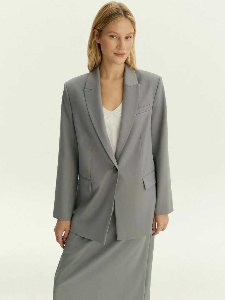 Универсальный, стильный и практичный жакет в сером цвете. Материал на четверть состоит из шерсти, сделан с добавлением эластана для лучшей посадки. Удлинённая модель прямого кроя дополнена двумя карманами с клапанами. На спинке снизу имеется разрез со шлицей. Жакет можно носить с брюками или юбкой из комплекта для более строгого образа или сочетать с джинсами для более расслабленного стиля. Может стать частью капсулы с брюками и жакетом peter. Изделие изготовлено на подкладке с вискозой