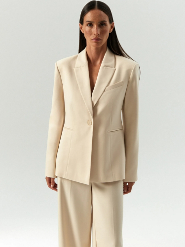 Базовый жакет молочно-бежевого оттенка — незаменимая вещь. Создаст эффектный образ и в будни, и в праздники. Визуально формирует женственный силуэт, отлично садится в животе и талии. Оптимальная длина бортов и рукавов смотрится респектабельно. Элегантная приталенная модель на одной пуговице дополнена изящными узкими карманами с листочкой и английским воротником. Завершить образ с жакетом можно юбкой или брюками из комплекта. Изделие выполнено из материала с высоким содержанием вискозы, на подкладке с вискозой