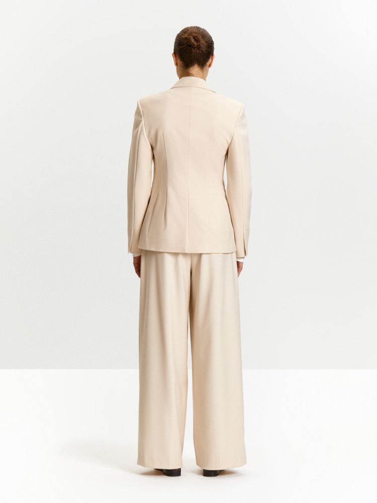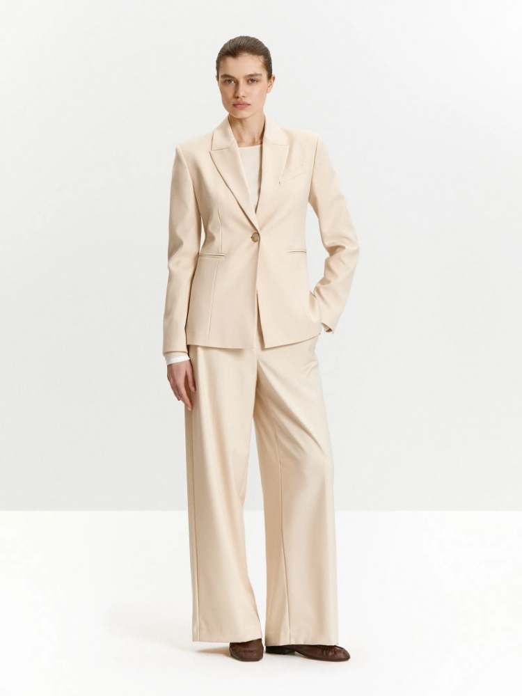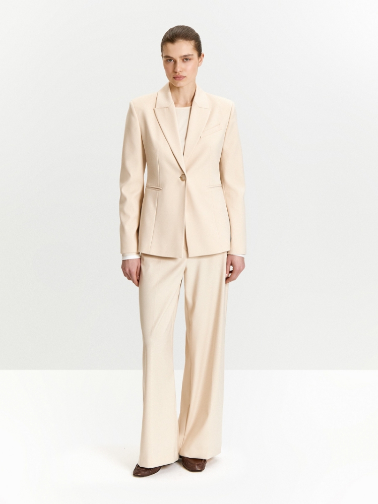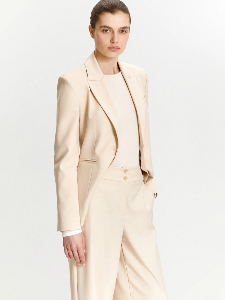 Базовый жакет молочно-бежевого оттенка — незаменимая вещь. Создаст эффектный образ и в будни, и в праздники. Визуально формирует женственный силуэт, отлично садится в животе и талии. Оптимальная длина бортов и рукавов смотрится респектабельно. Элегантная приталенная модель на одной пуговице дополнена изящными узкими карманами с листочкой и английским воротником. Завершить образ с жакетом можно юбкой или брюками из комплекта. Изделие выполнено из материала с высоким содержанием вискозы, на подкладке с вискозой