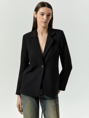 Удлинённый жакет на одной пуговице со скруглёнными лацканами — мягкая классика для офисных, повседневных и творческих образов. Со стороны спинки через всё изделие проходит безупречный, ровный шов: он визуально вытягивает силуэт и добавляет немного строгости. Чеканка на пуговице с эффектом чернения добавляют неброскую изюминку в образ. Жакет выполнен из приятного твида в чёрном цвете, отлично сочетается с денимом