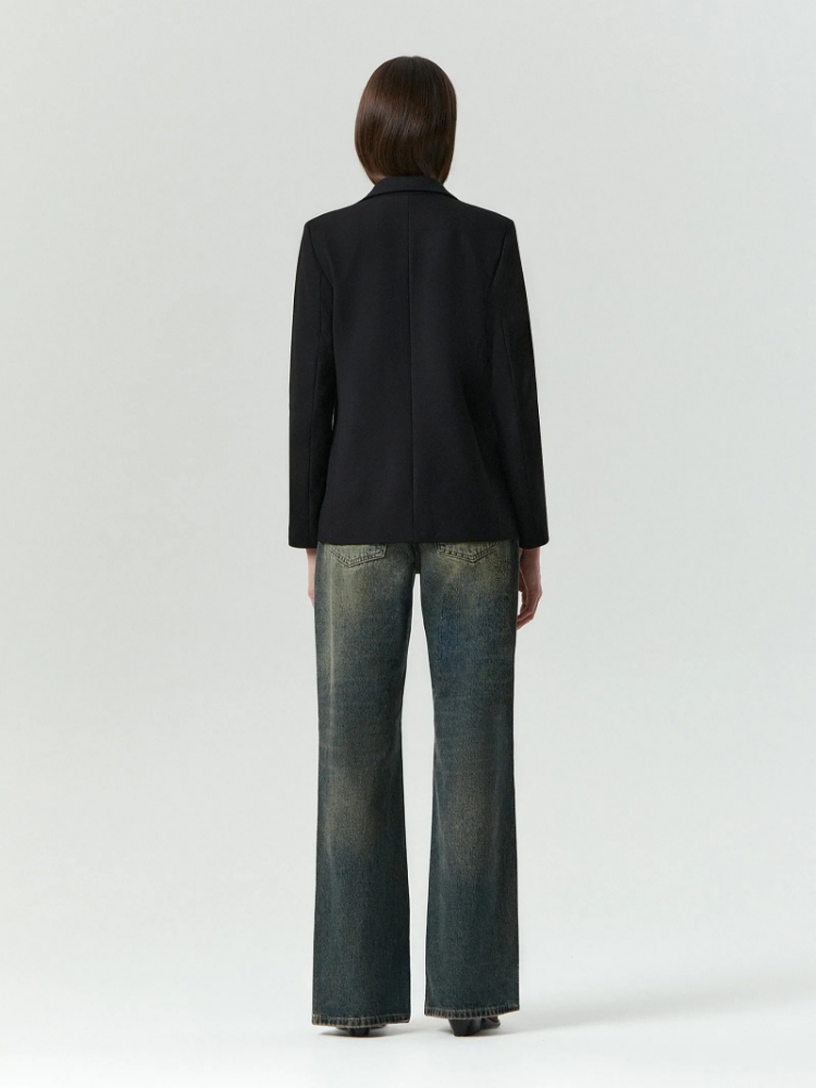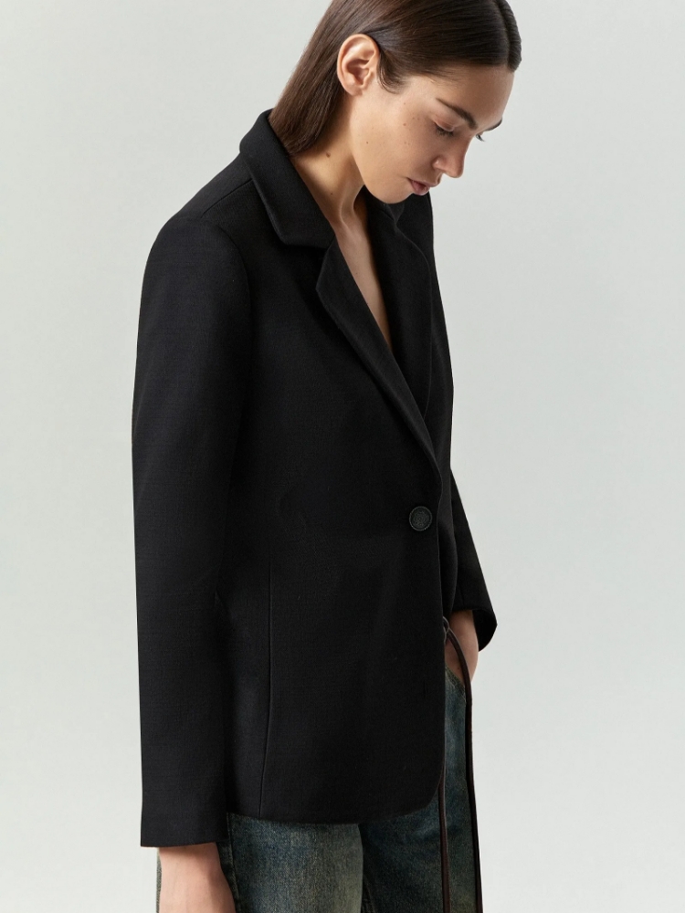 Удлинённый жакет на одной пуговице со скруглёнными лацканами — мягкая классика для офисных, повседневных и творческих образов. Со стороны спинки через всё изделие проходит безупречный, ровный шов: он визуально вытягивает силуэт и добавляет немного строгости. Чеканка на пуговице с эффектом чернения добавляют неброскую изюминку в образ. Жакет выполнен из приятного твида в чёрном цвете, отлично сочетается с денимом