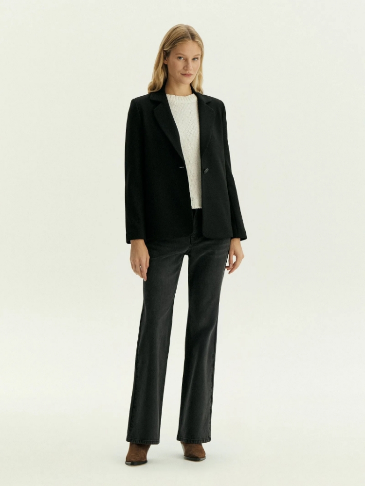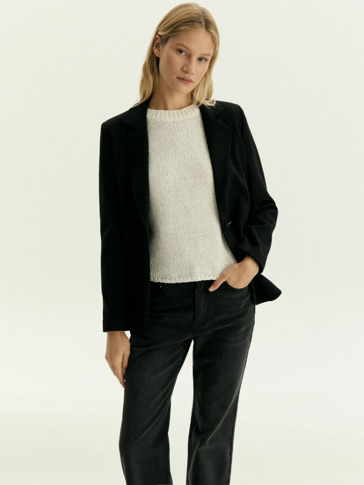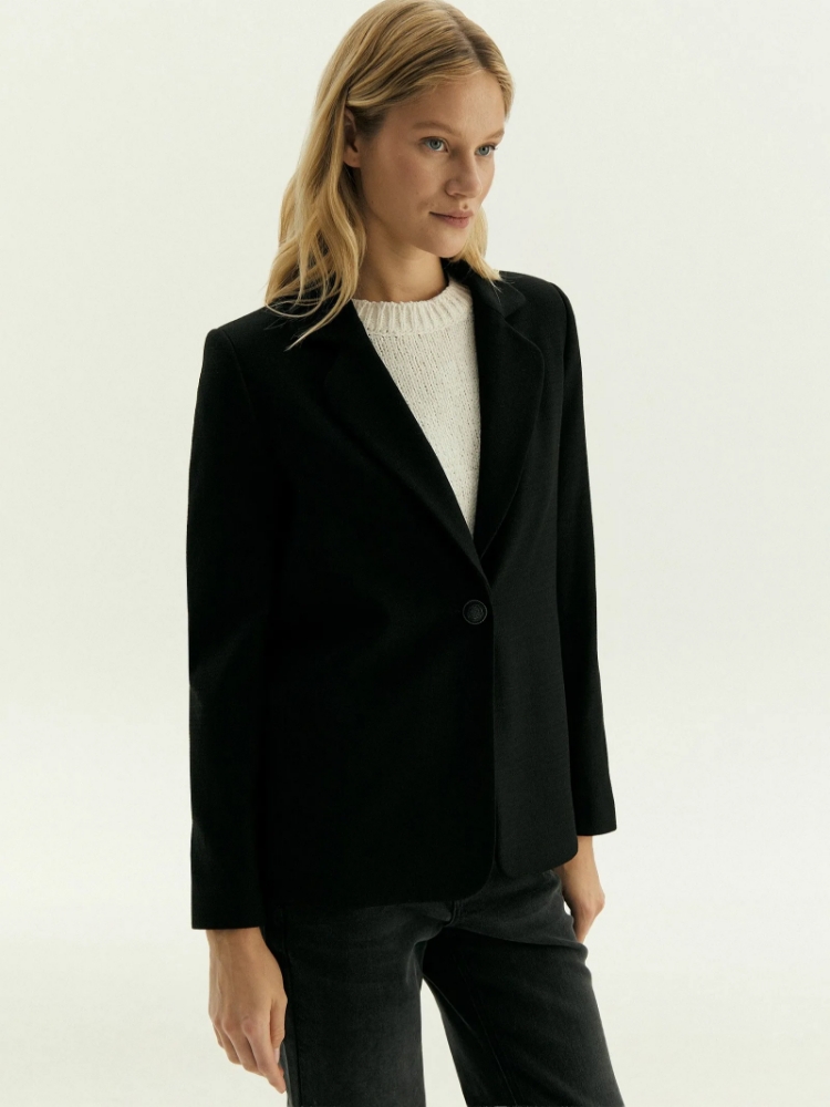 Удлинённый жакет на одной пуговице со скруглёнными лацканами — мягкая классика для офисных, повседневных и творческих образов. Со стороны спинки через всё изделие проходит безупречный, ровный шов: он визуально вытягивает силуэт и добавляет немного строгости. Чеканка на пуговице с эффектом чернения добавляют неброскую изюминку в образ. Жакет выполнен из приятного твида в чёрном цвете, отлично сочетается с денимом