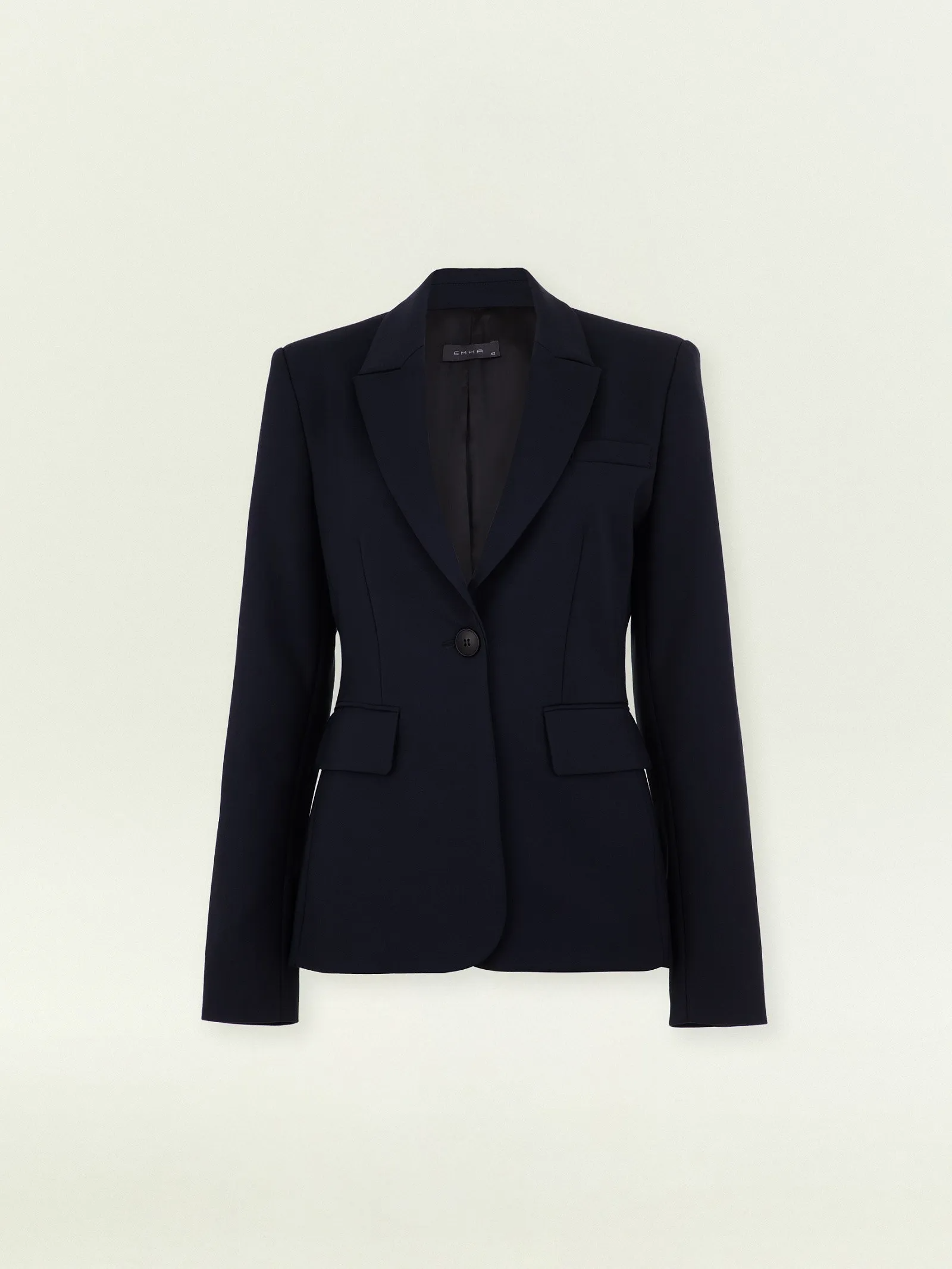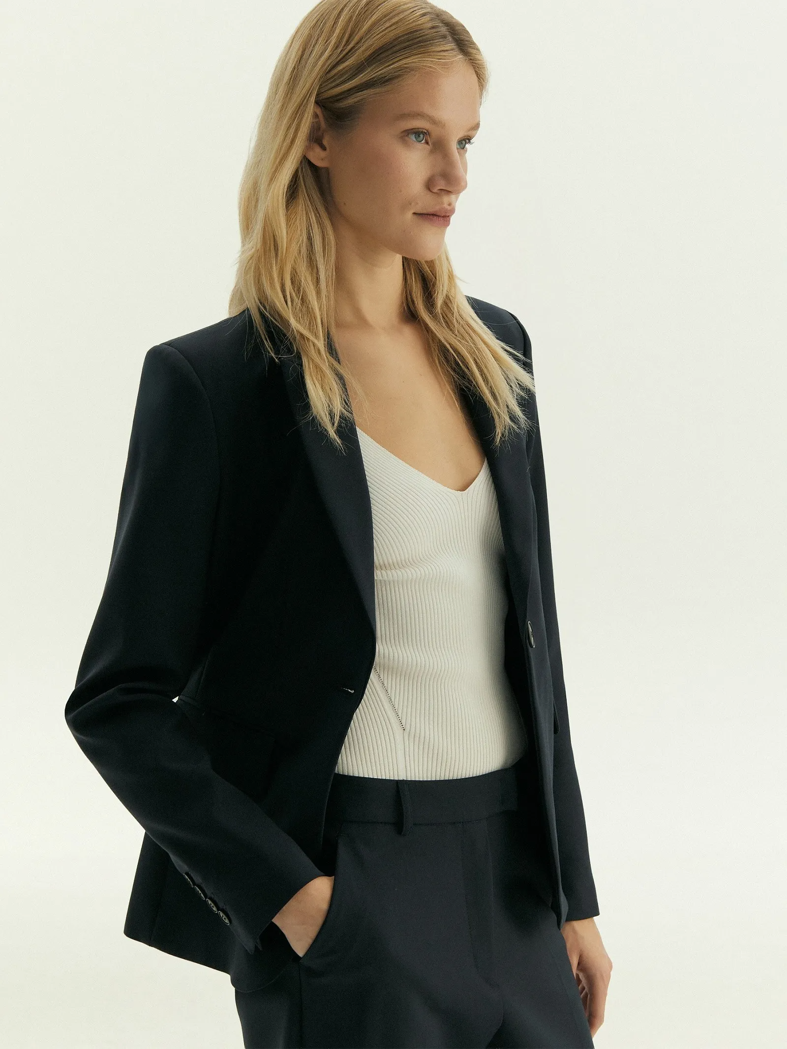 Этот классический жакет в тёмно-синем цвете — идеальный вариант даже для строгого дресс-кода. Английский воротник, элегантный фальш-карман с листочкой, стройные ряды пуговиц на рукавах и аккуратная шлица создают безупречный деловой образ. Приталенный крой добавляет женственности. Жакет сочетает в себе сдержанность, представительность и элегантность. Выполнен из плотной костюмной ткани с содержанием хлопка и вискозы, что делает его более дышащим и комфортным. Имеется подкладка с высоким содержанием вискозы.