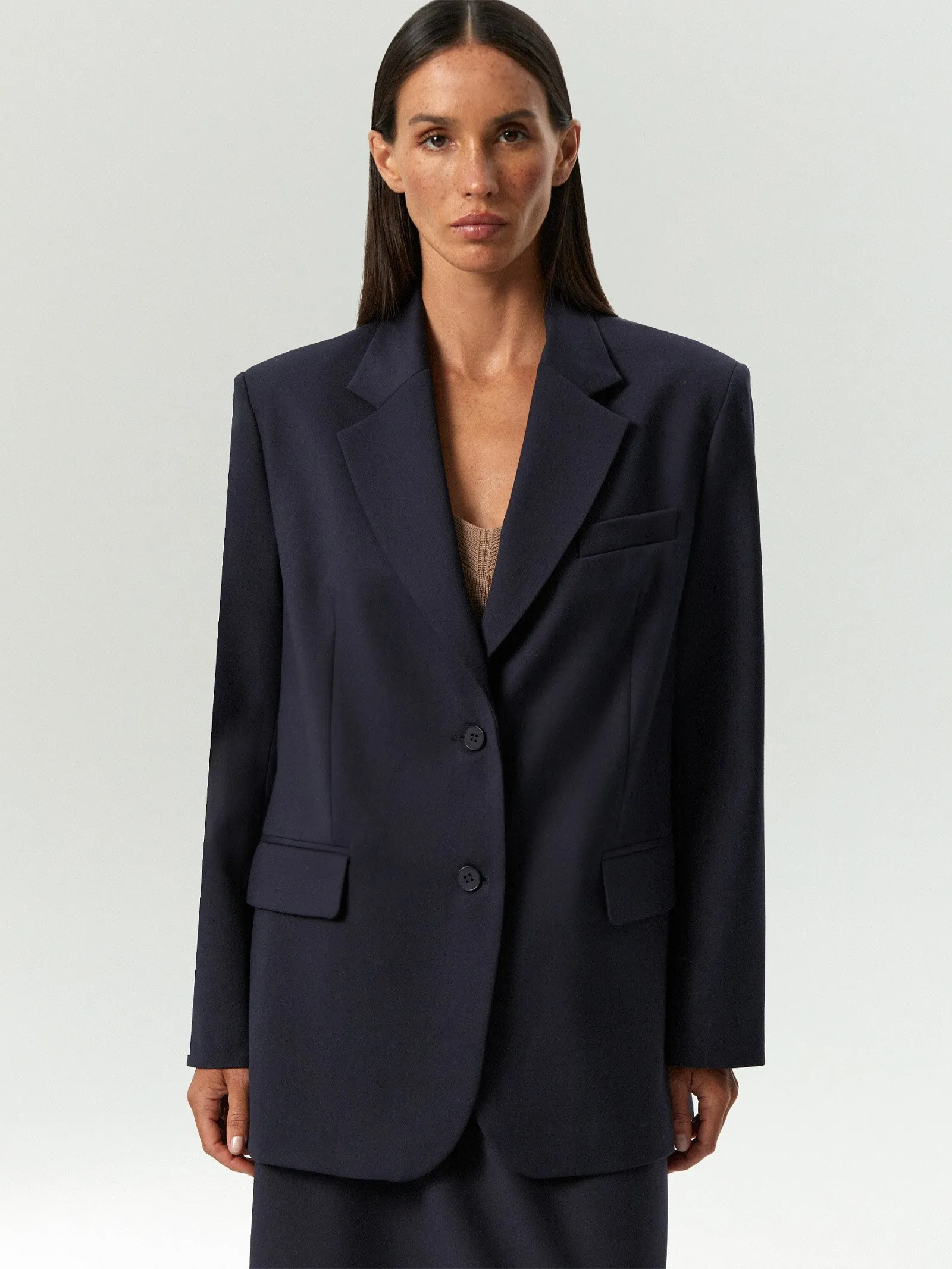 Тёмно-синий однобортный жакет в трендах года. Удлинённый прямой фасон дополняют расширенная линия плеч с выраженными подплечниками, а также широкие лацканы и клапаны на карманах. Изделие выполнено из материала с высоким содержанием вискозы, на подкладке с вискозой.
