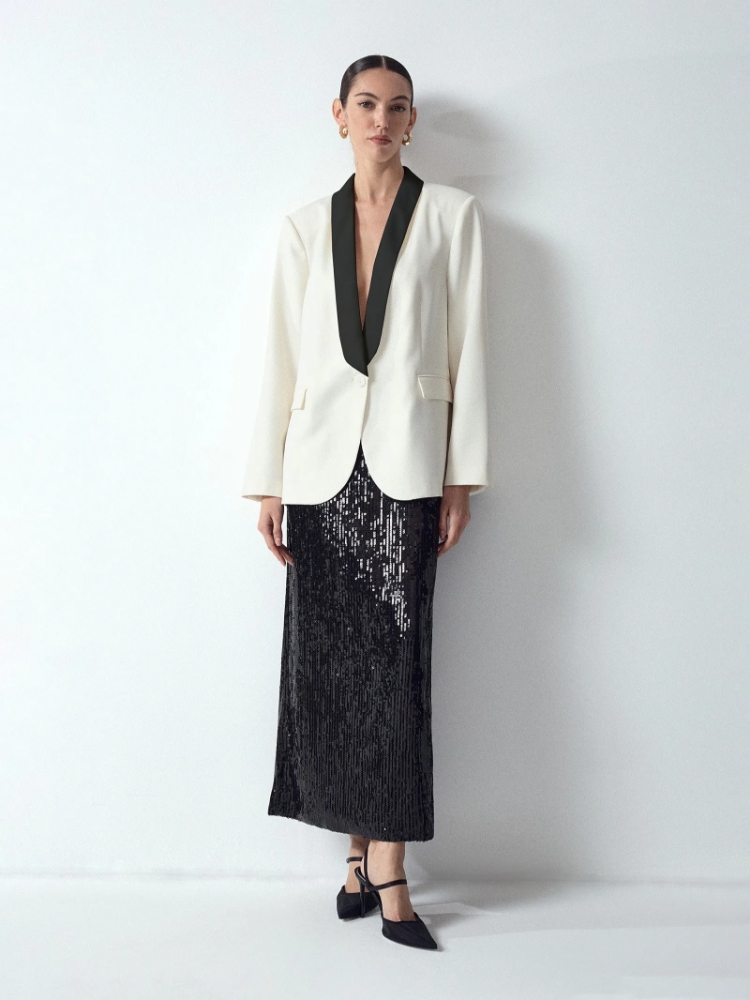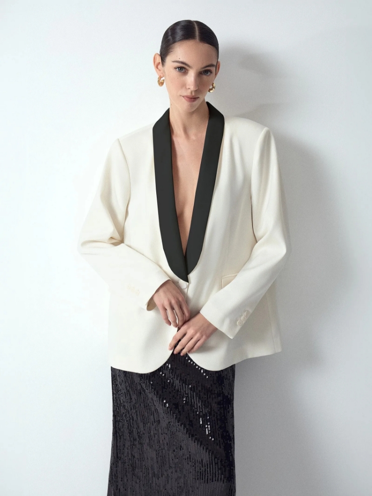 Однобортный жакет-смокинг в стиле Марлен Дитрих с контрастным шалевым воротником — это элегантная классика, приправленная лёгкой ноткой дерзости. Жакет станет идеальным вариантом, если не хочется сильно отступать от делового стиля и в то же время нужно выглядеть эффектно. Его также можно вписать в стиль спорт-шик, добавив к дениму или расслабленным брюкам на резинке. Для большей утонченности образ с жакетом можно усложнить аксессуарами: например, ниткой жемчуга. Изделие выполнено на подкладке с содержанием вискозы