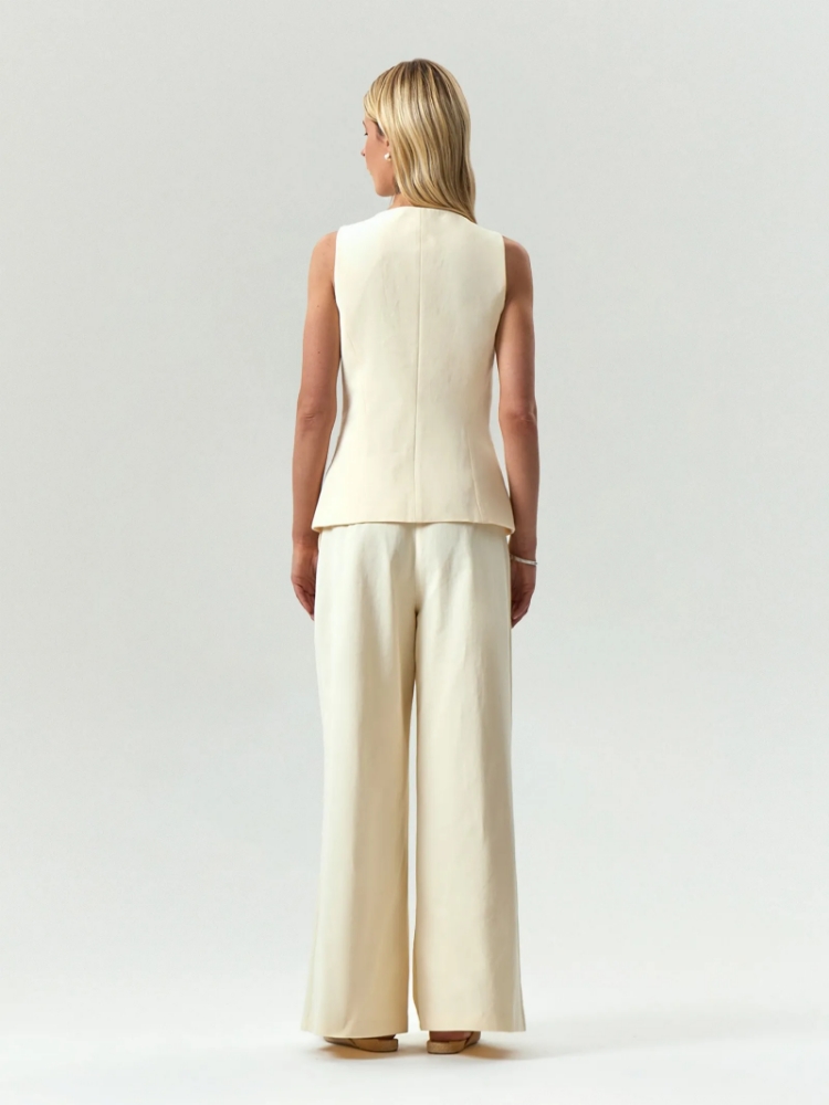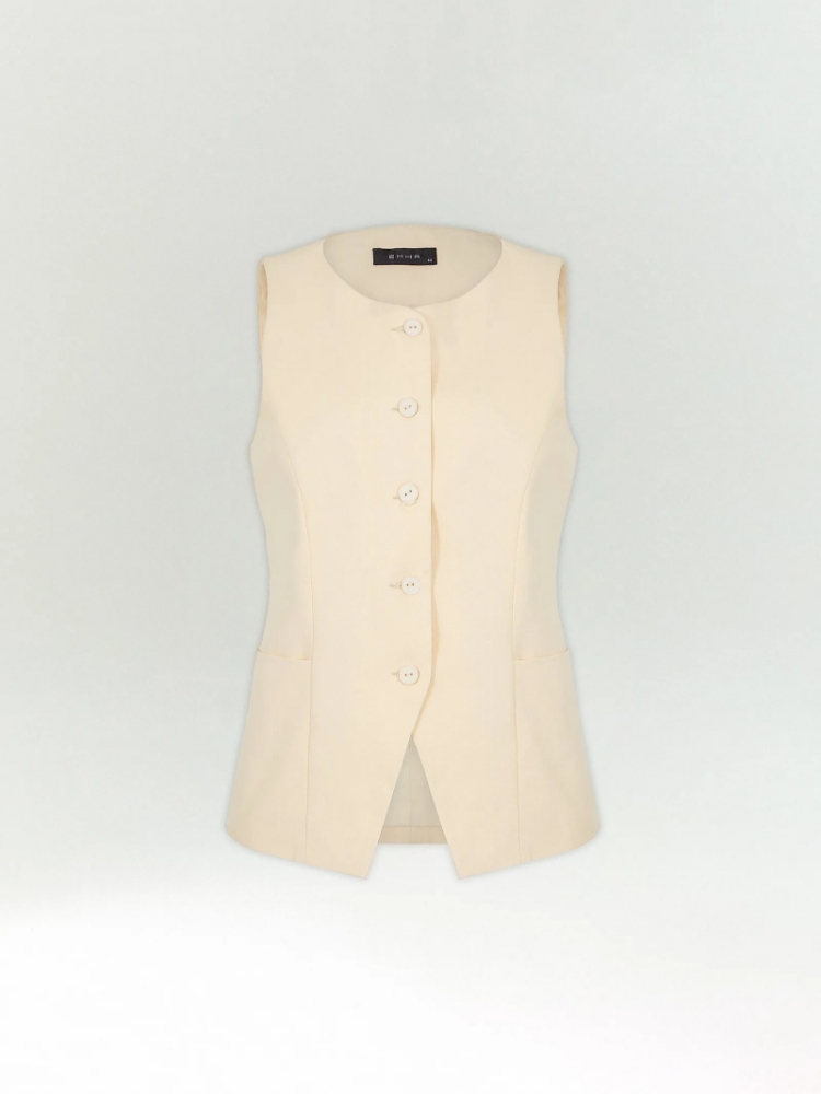 Модный жилет в молочном цвете. Материал состоит полностью из хлопка, что делает его идеальным выбором на лето. Модель приталенного кроя имеет фигурную линию борта и дополнена вместительными карманами, уходящими в линию вытачек. Завершить образ можно брюками из комплекта. Изделие изготовлено на подкладке с хлопком