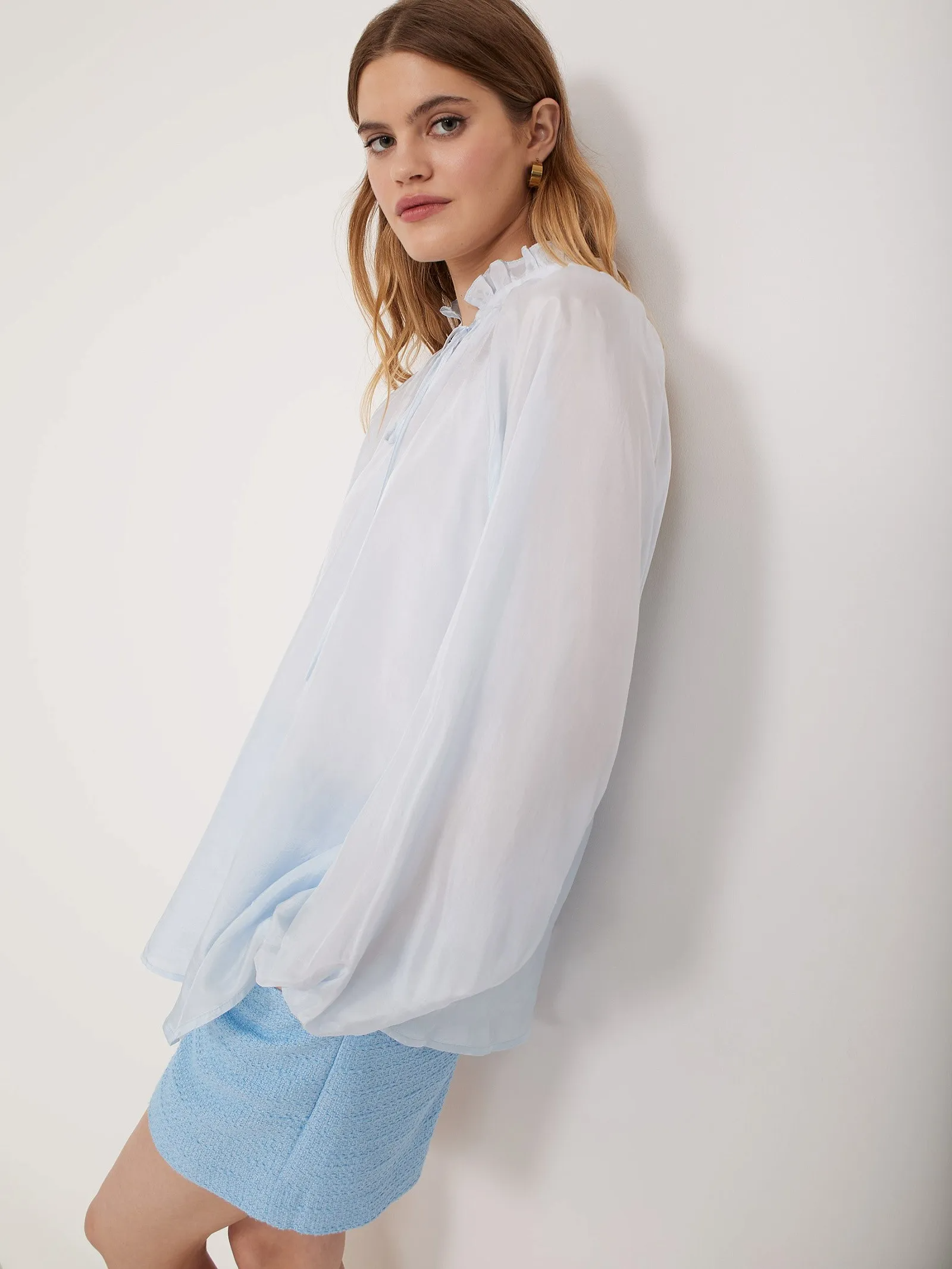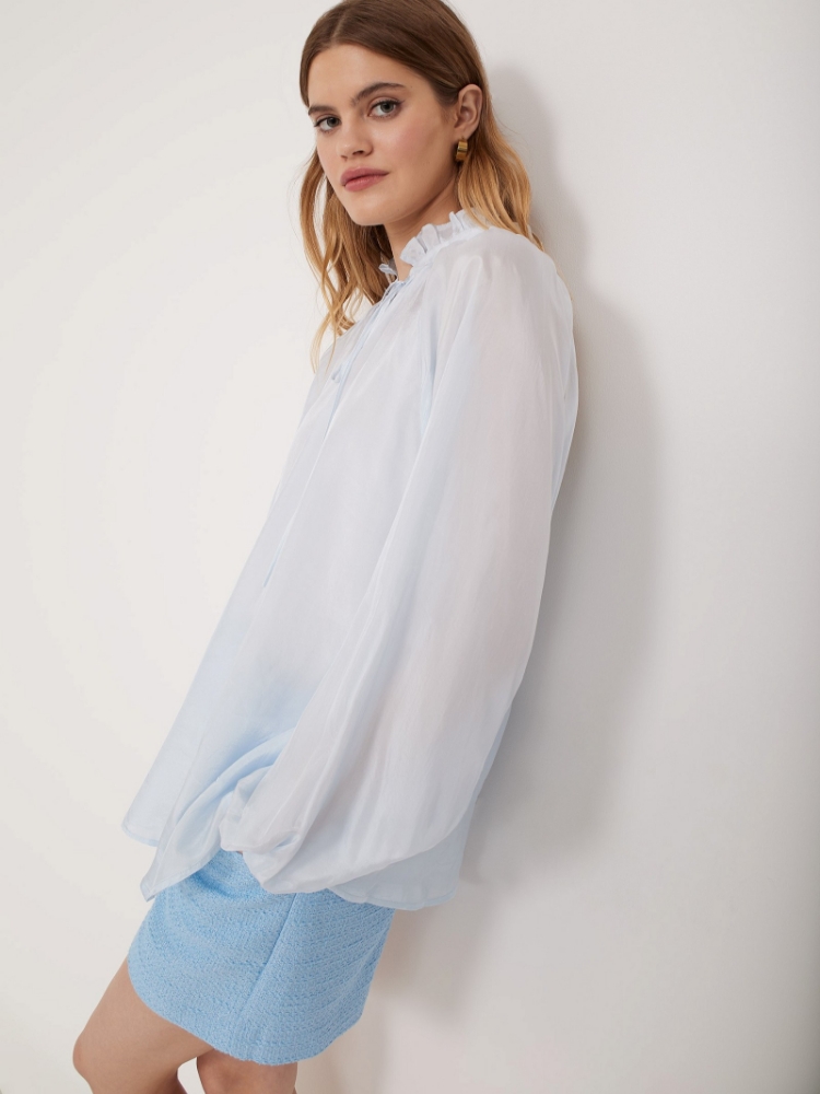 Нежная блузка с лёгким блеском идеальна для женственных образов на любой случай. Невысокий воротник-стойка с аккуратными оборками и кокетливая завязка над сдержанным V-вырезом создают приятное впечатление. Самый светлый оттенок голубого, широкий крой и рукава со сборкой на резинке подчёркивают воздушность образа. Блузка обладает широкой сочетаемостью: можно создать изысканный образ с атласной юбкой, соблазнительный и дерзкий — с кожаными брюками, кэжуал-шик с денимом, надеть в офис с костюмными брюками. Или составить эффектные сочетания со многими другими элементами гардероба. Прозрачная блузка со свободным рукавом отлично подходит для создания многослойных образов. Будет интересно смотреться как второй слой с топом. Изделие выполнено из вискозы