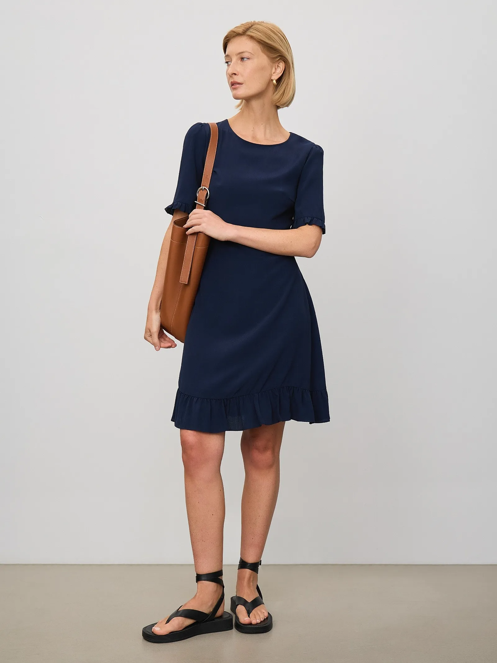 Летнее платье в темно-синем цвете станет отличным выбором для отпуска и романтических моментов. Идеально, чтобы наслаждаться морским бризом и пить коктейль на веранде прибрежного кафе. Главная изюминка модели — крупный фигурный вырез сзади под бантом. Нежный рукав длиной немного выше локтя выполнен со сборкой по окату и деликатыми оборками по краям. Низ платья отделан крупными оборками. Модель имеет длину немного выше колена. Платье изготовлено из вискозы, без подкладки.