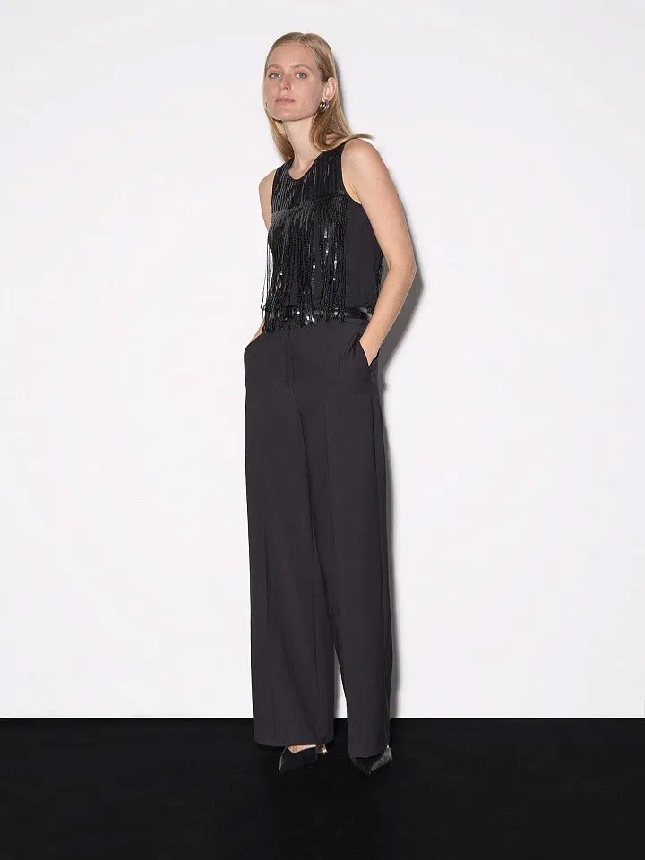 Эффектный чёрный топ с бахромой из пайеток. Поблёскивающие длинные нити пайеток спереди и сзади будут отлично смотреться в движении, особенно в танце. Модель прямого кроя с круглым вырезом красиво открывает плечи и ключицы. Идеальный выбор для дискотеки или вечера в баре с подругами. Дополнить можно базовыми джинсами или юбкой с пайетками
