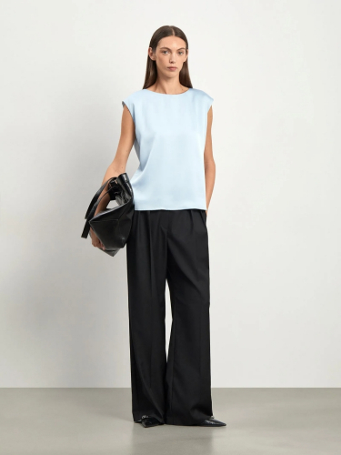 Светло-голубой топ из лёгкого, шелковистого, струящегося материала с содержанием вискозы. Удлинённая модель прямого кроя имеет неглубокий круглый вырез. Топ без рукавов со спущенным плечом позволяет создавать элегантные образы для любого случая. Сочетается как с базовым денимом, так и с нарядной юбкой. Изделие выполнено на подкладке из вискозы