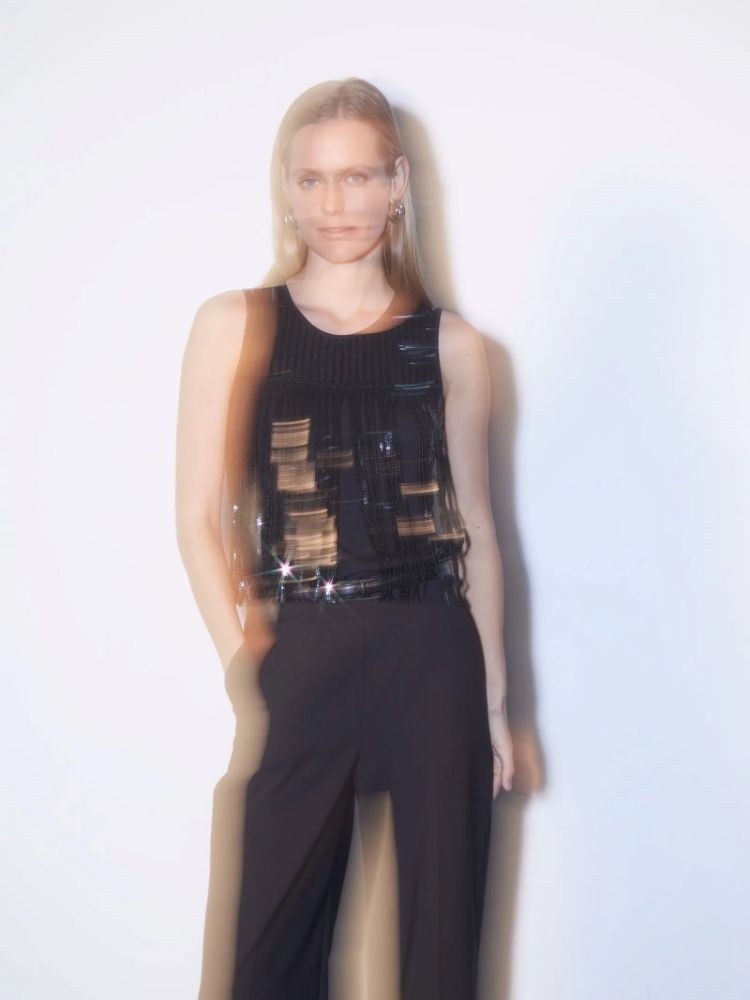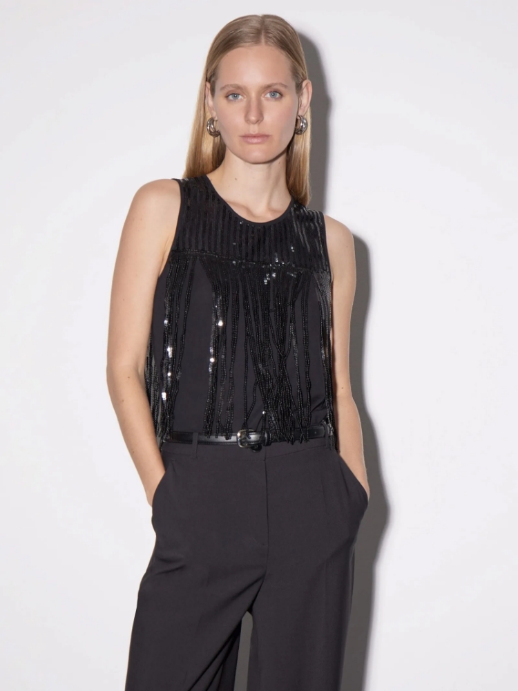 Эффектный чёрный топ с бахромой из пайеток. Поблёскивающие длинные нити пайеток спереди и сзади будут отлично смотреться в движении, особенно в танце. Модель прямого кроя с круглым вырезом красиво открывает плечи и ключицы. Идеальный выбор для дискотеки или вечера в баре с подругами. Дополнить можно базовыми джинсами или юбкой с пайетками