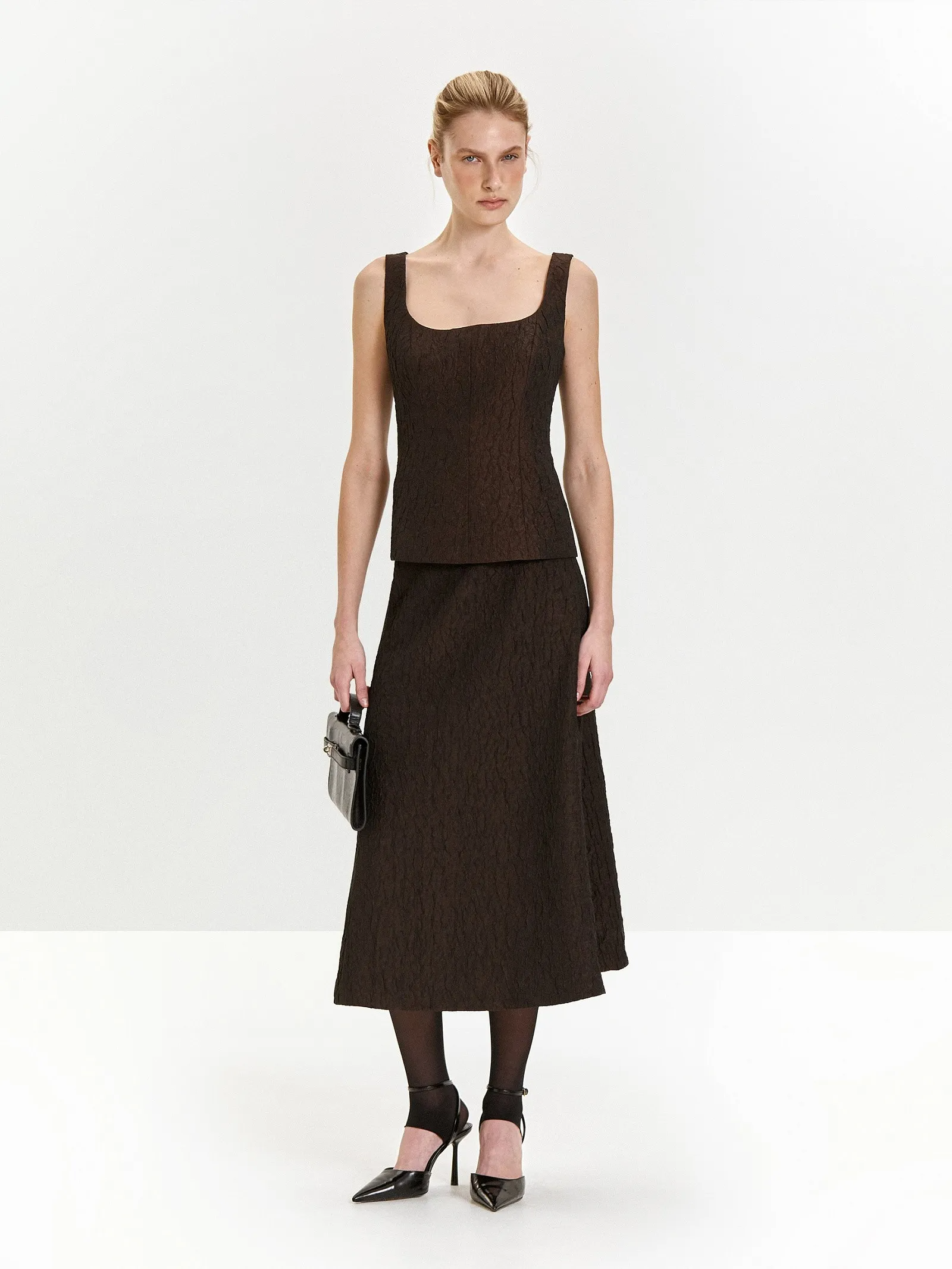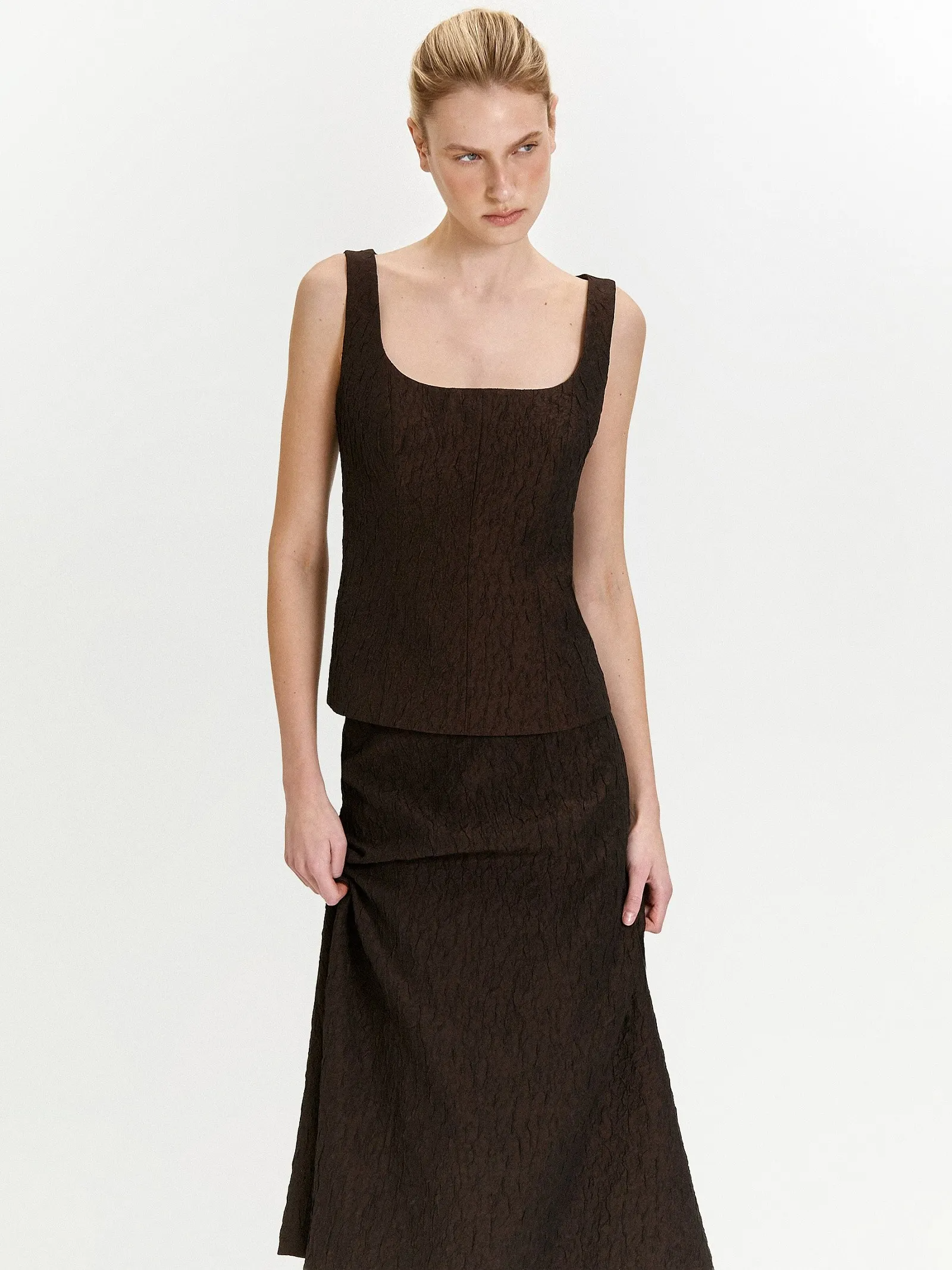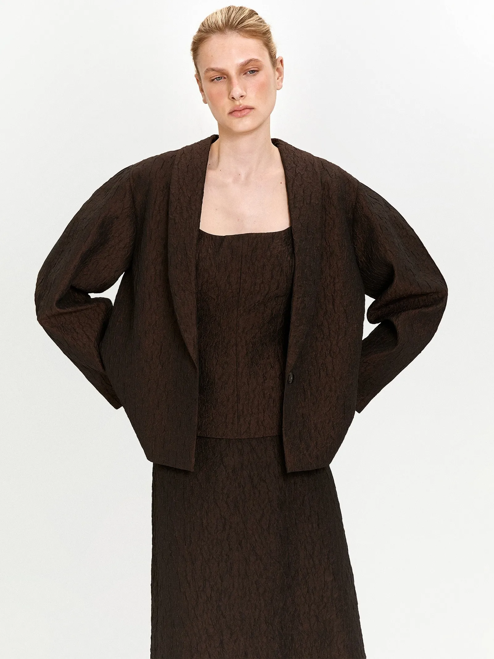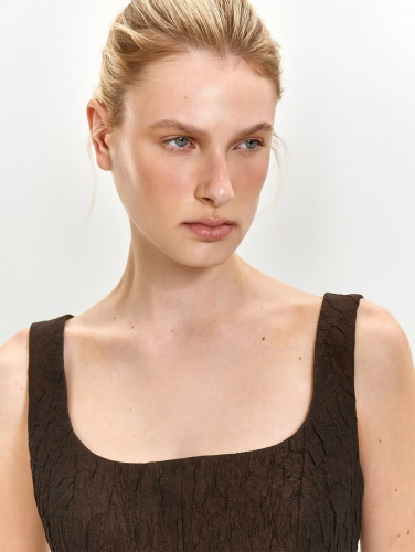 Тафта с краш-эффектом в глубоком цвете шоколада — новое в нашей коллекции. Этот выбор отражает свежие тренды с подиумов и заземляющий фокус на телесные ощущения.