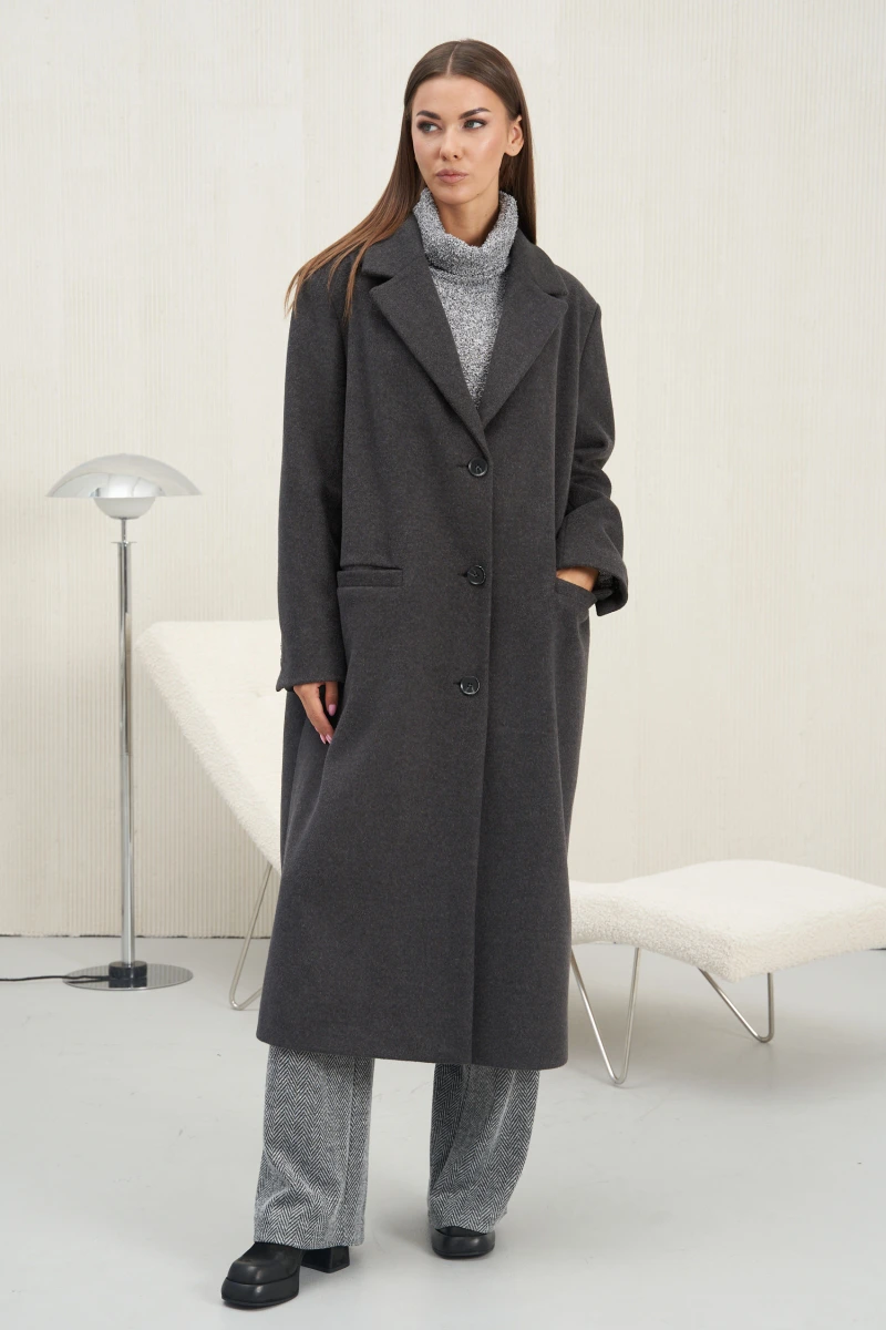Пальто в традиционной стилистике . Выразительные силуэты из 90-х с широкими плечами и акцентными пуговицами, длины макси заняли лидирующие позиции. Они смотрятся дорого и элегантно.Прямой свободный силуэт, втачной покрой, классический английский воротник, центральная застёжка. Полочка с нагрудной вытачкой и прорезными карманами с листочкой. Спинка с центральным швом, высокой шлицей отделочной деталью в верхней части. Рукав двухшовный отлётной шлицей.Длина изделия около 120 см.Длина рукава около 72 см.