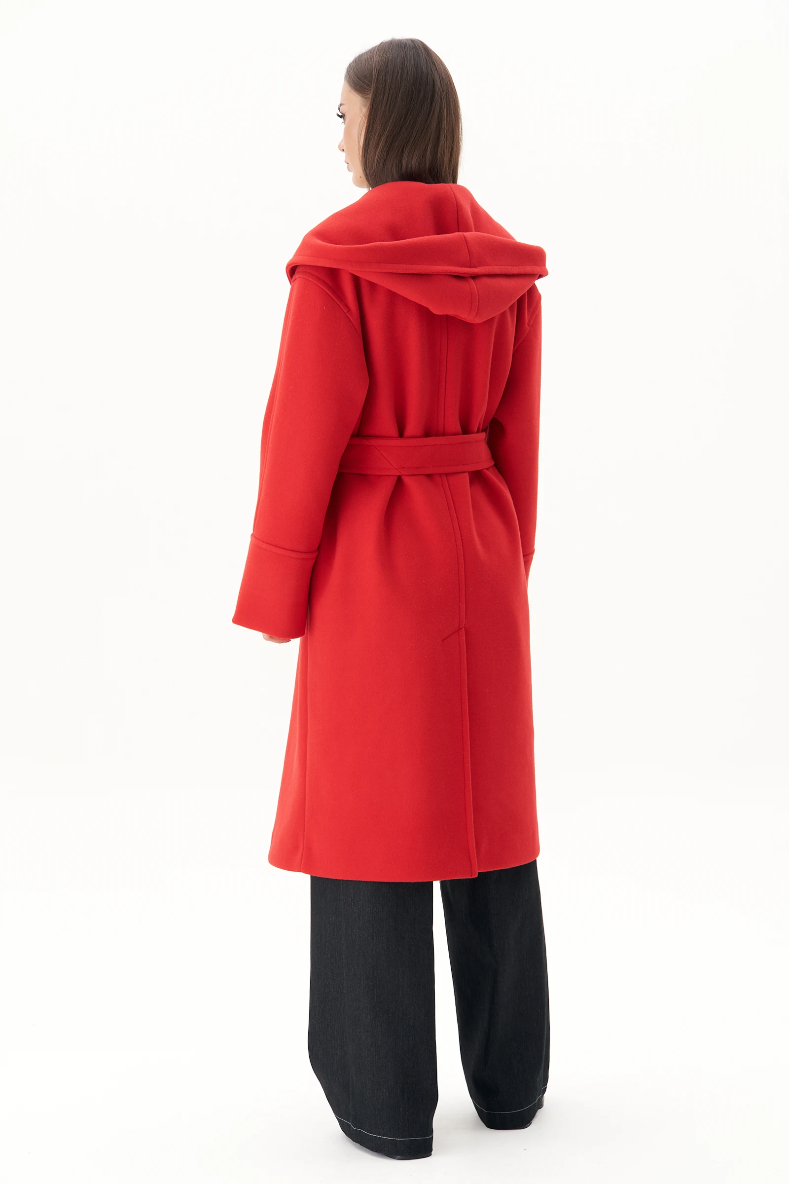 Ярко-красный - классический цвет, который никогда не выходит из моды, но в последнее время модные инфлюэнсеры вновь активно используют его в своих образах. По последнему исследованию красное пальто в топе поисковых запросов, а это значит, что носить его будут по всему миру, а не только на подиуме. Что лучше, чем красное пальто, способно скрасить унылый образ или день.Свободный, упрямлённый силуэт, покрой на заниженной линии плеча, рукаву двухшовный, расширенный в области оката, двубортная застёжка, воротник - капюшон.Полочка с прорезными карманами с листочками. Рукав с отрезной манжетой. Спинка с центральным швом и шлицей. Модель дополнена съёмным поясом.