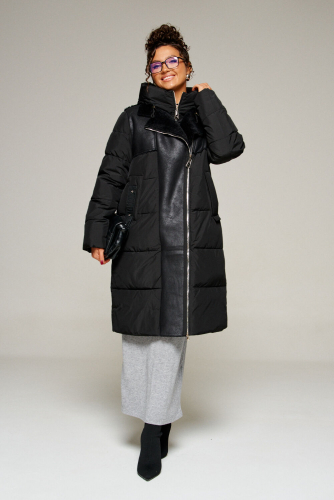 Перед с подрезной кокеткой из экокожи и с симметричными боковыми прорезными карманами с широкой обтачкой, фиксируемые на кнопку. На правом кармане выполнен декоративный элемент в виде широкой репсовой тесьмы. Центральная вставка переда, переходящая в воротник, выполнена из двусторонней экокожи, где внутренняя сторона – искусственный мех «овчина».