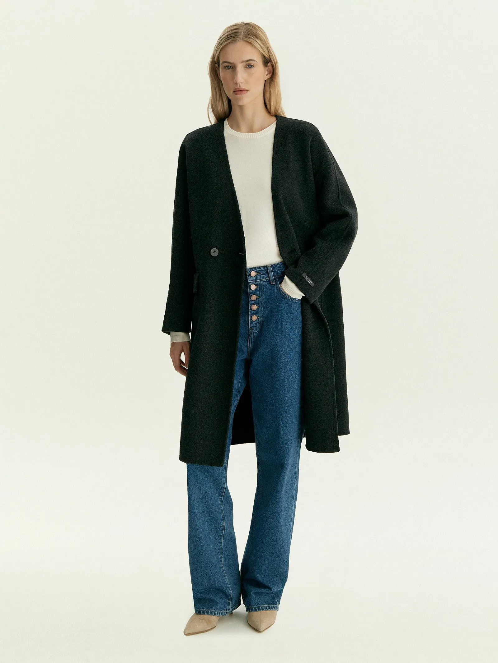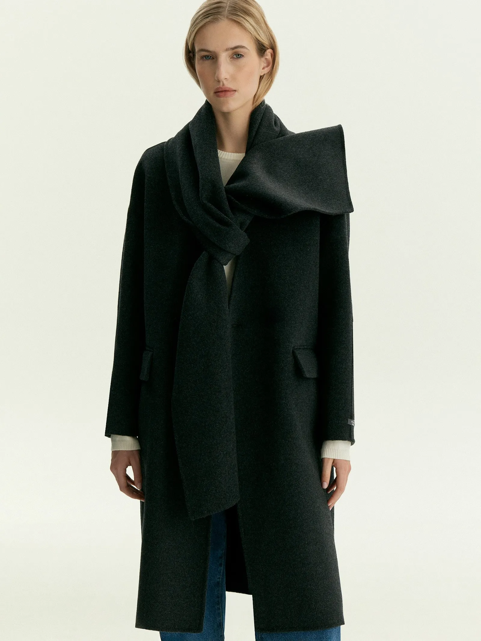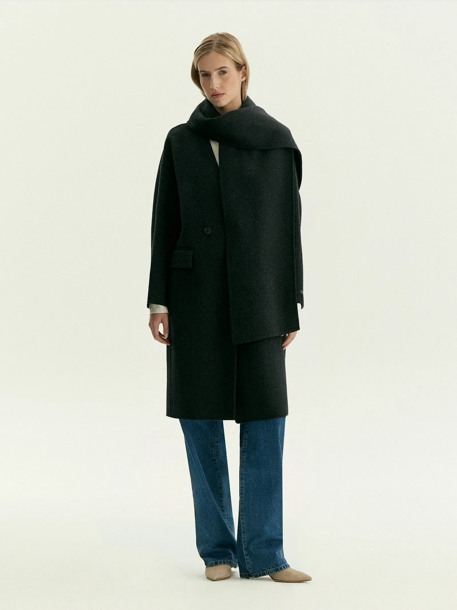 Пальто-кокон средней длины с V-вырезом стильно завершит любой образ. Пальто имеет две пуговицы, которые располагаются на одном уровне. Изюминкой образа станет шарф-палантин из того же материала, который идёт в комплекте. Материал сделан из шерсти с добавлением нейлона для ещё большей износостойкости. Выполнено без подкладки. Температурный режим до 0°C.