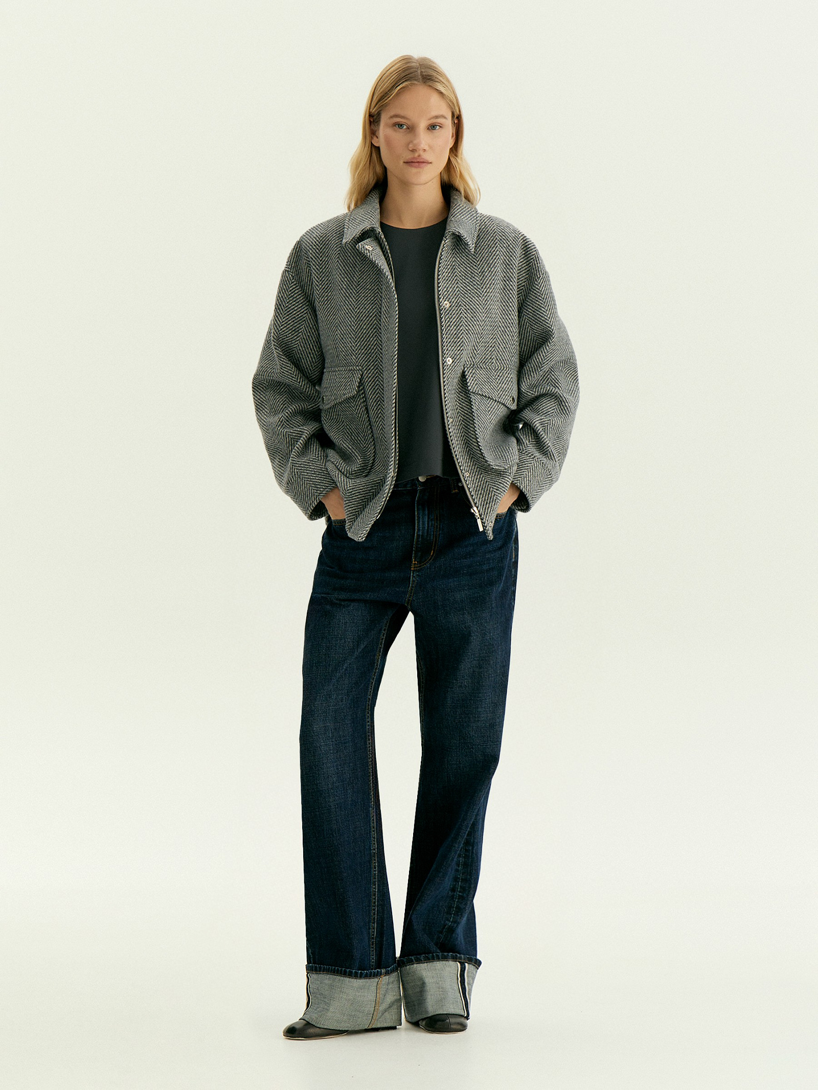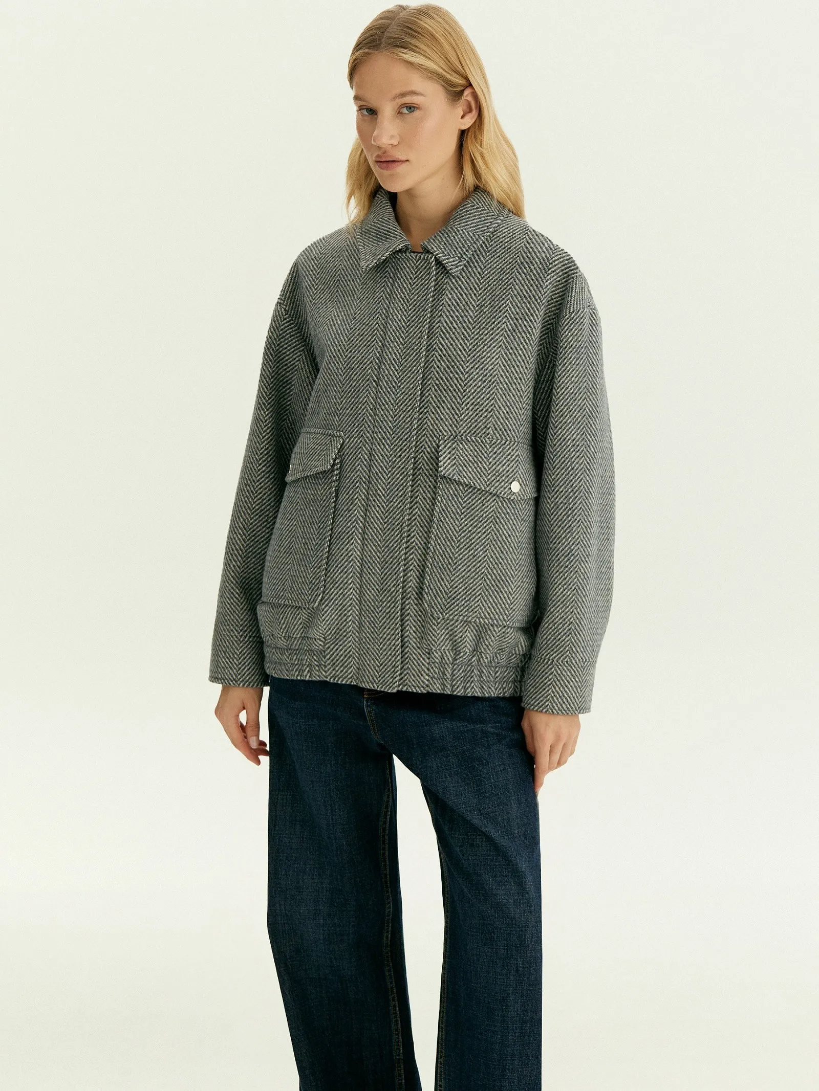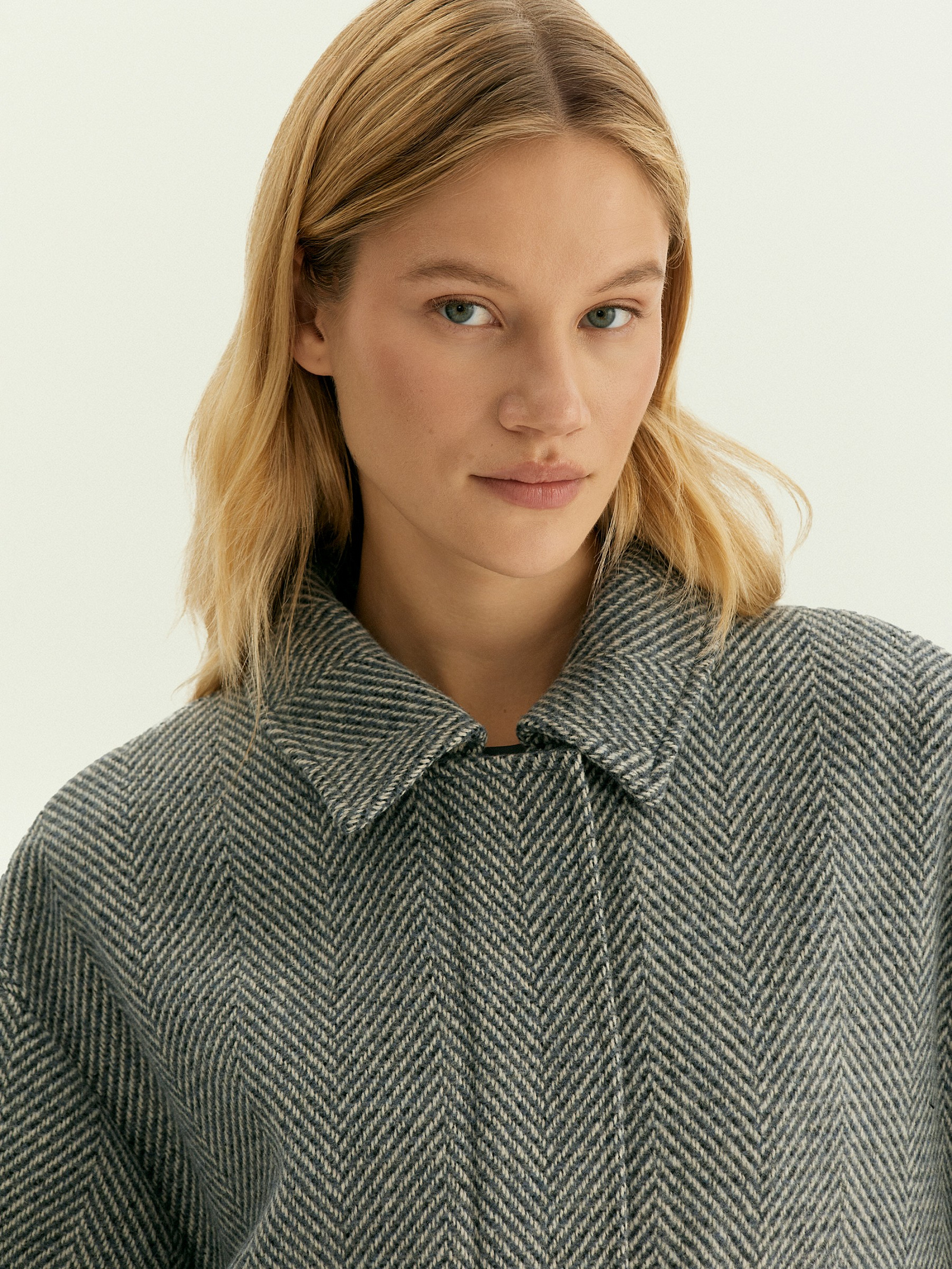 Ретро-ёлочку осовременивают модный укороченный формат, актуальный силуэт и трендовые детали в виде крупных накладных карманов.