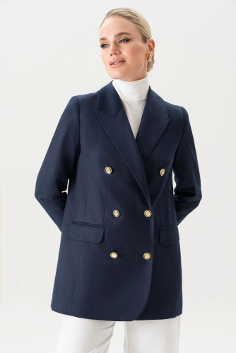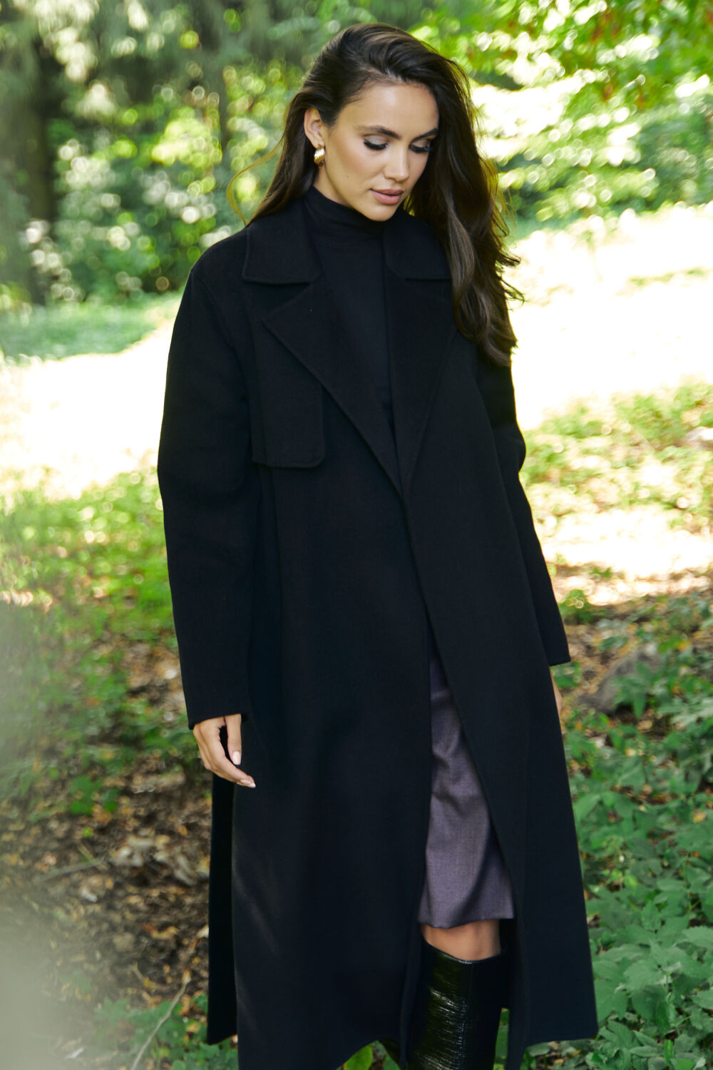 Правая часть переда с отлетной кокеткой. Спинка со средним швом, шлицей и с отлетной кокеткой. Боковые швы с карманами и с настрочными шлевками по линии талии. Горловина оформлена широким воротником пиджачного типа. Правый борт переда с потайной суппатной застежкой на 3 петли. Рукава втачные, двухшовные, с широким припуском подгиба низа, позволяющим завернуть низ рукава наверх как отложную манжету. Средняя длина пальто  по среднему  шву спинки - 124,0 см (±2,0 см);