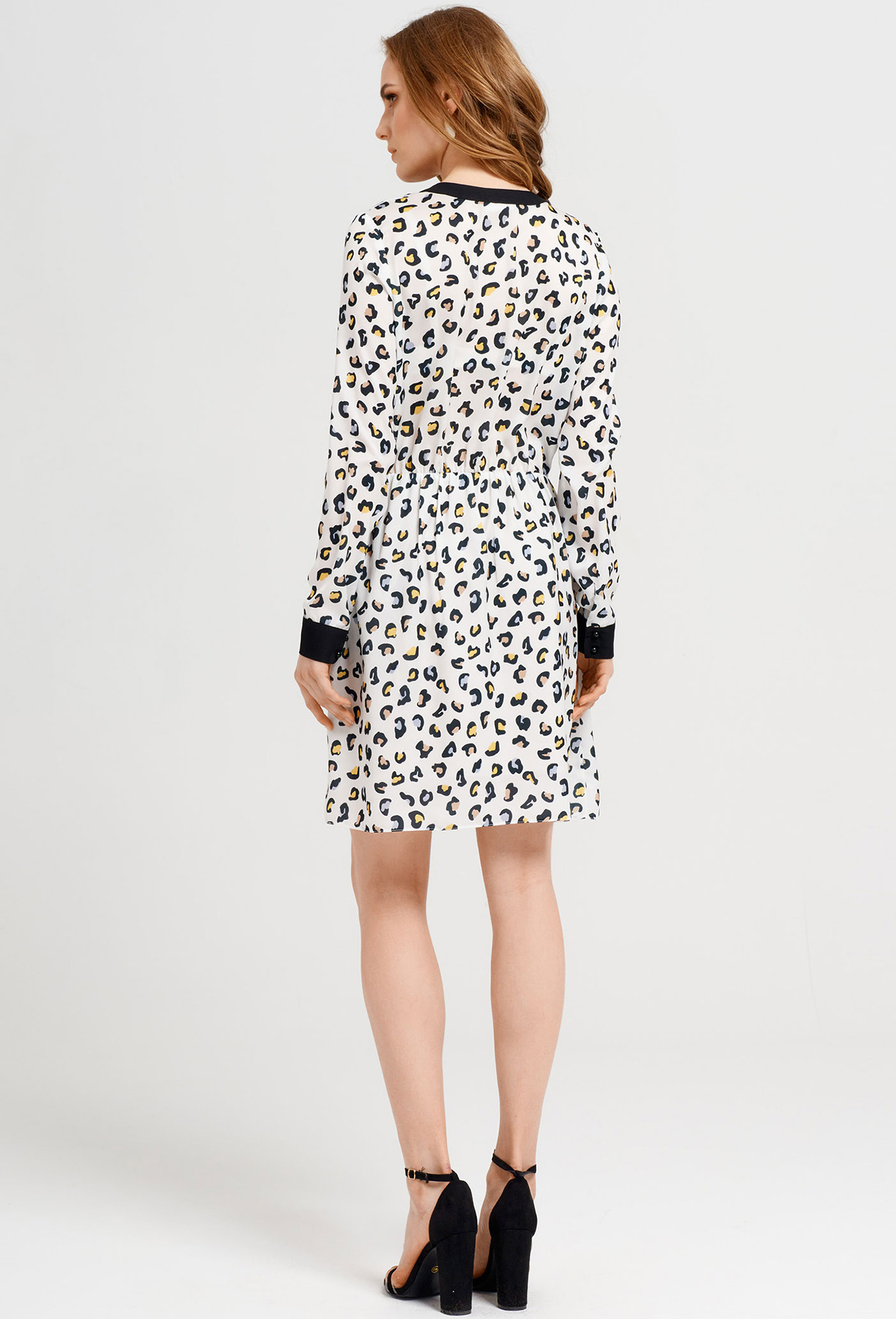 Платье с резинкой по талии. Рукав втачной длинный, по низу рукава расположена манжета из контрастного материала по горловине планка с продолжением завязывающаяся на бант, так же выполнена из контрастного материала.
