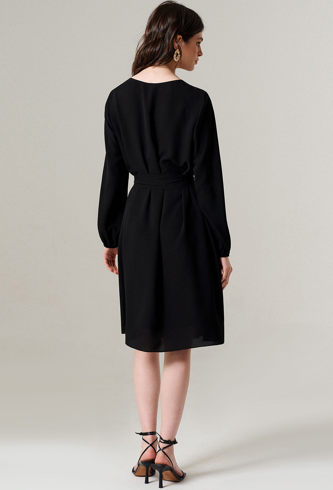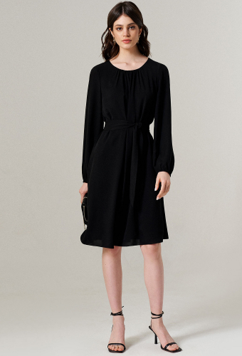 Женское платье с длинным рукавом и поясом на талии.