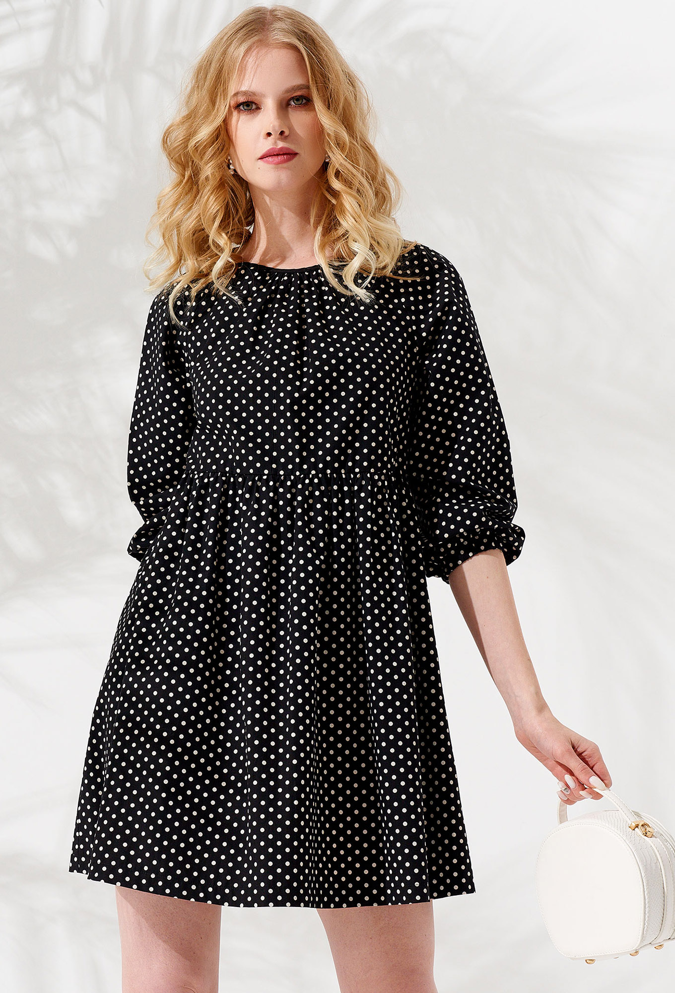 Платье короткое с пышными рукавами, круглый вырез горловины и пышные рукава на манжете делают молодежное платье кокетливым и скромным. Оно свободное, дарит комфорт, хорошо подойдет для жаркого лета.