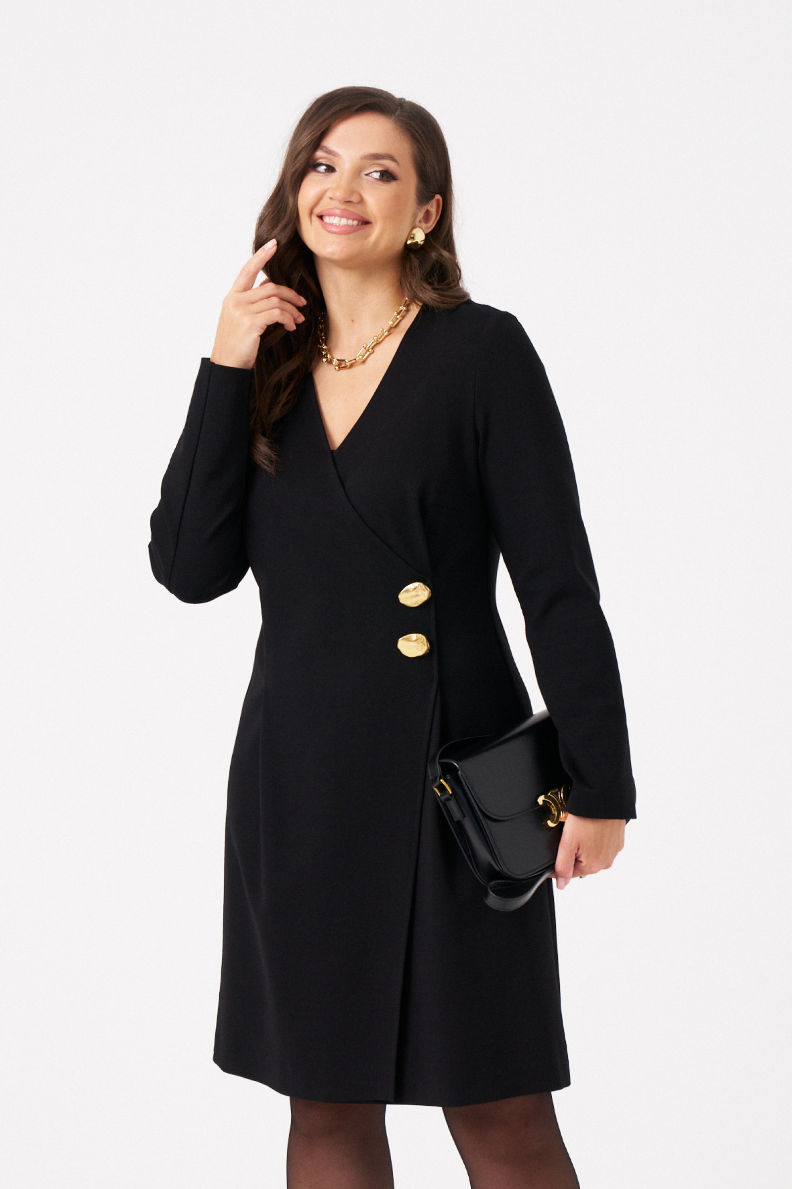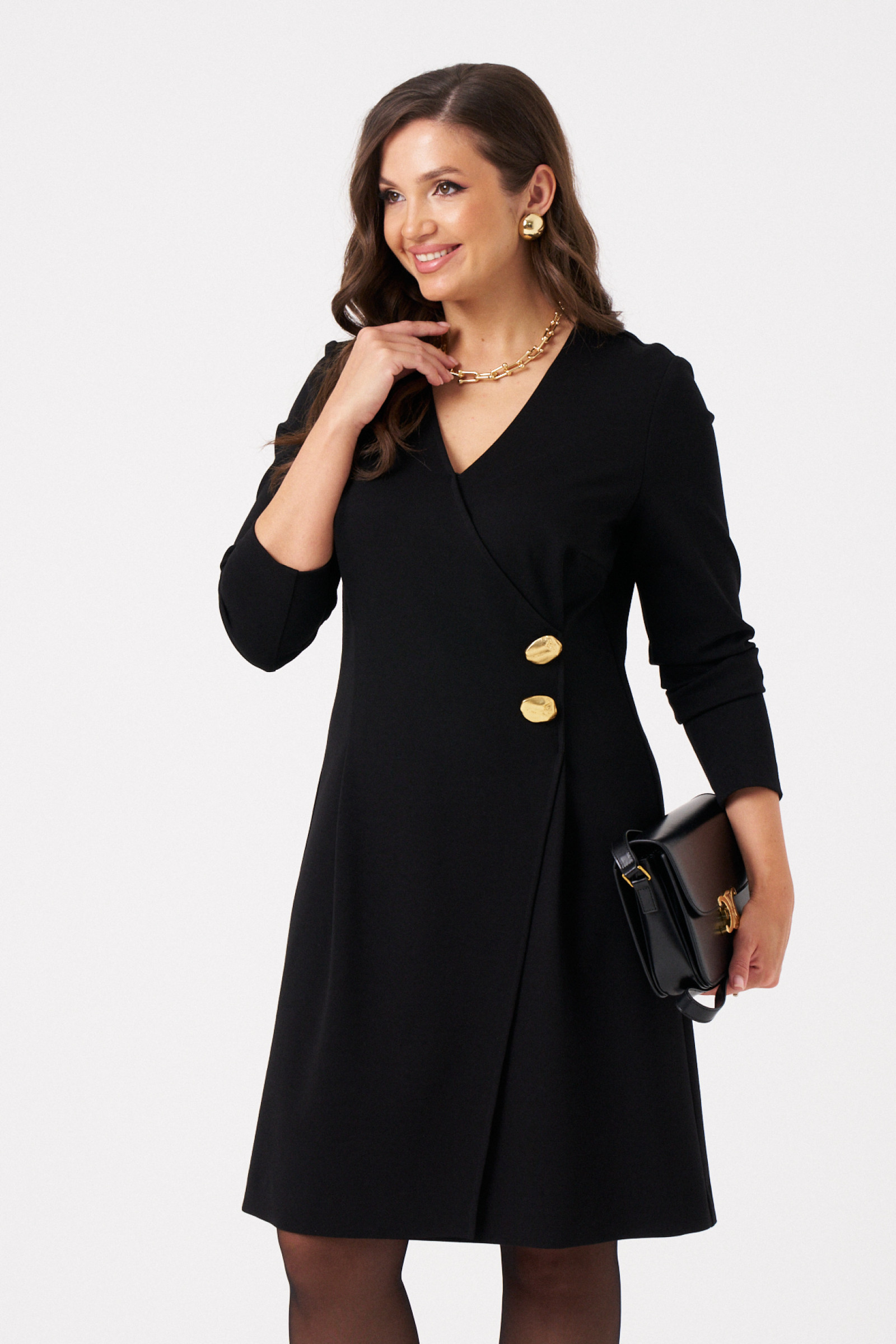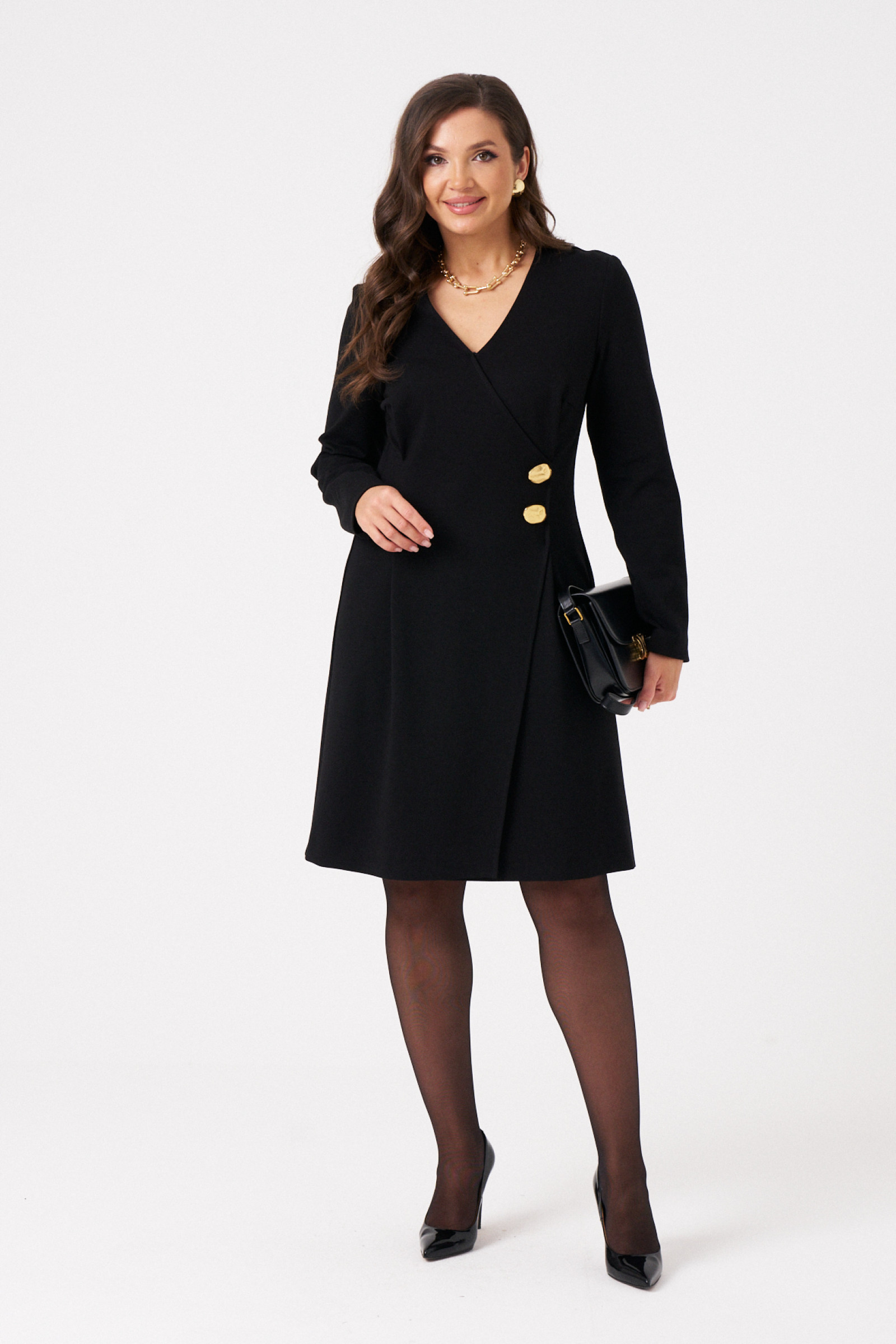 Это женское платье из трикотажного поливискозного полотна идеально подходит для повседневной носки. Модель выполнена в полуприлегающем силуэте, что обеспечивает комфорт и элегантность. Платье на запах с имитацией застежки создает эффектный и женственный образ. Перед украшен декоративной золотистой пуговицей и двумя складками, добавляющими изящности. Спинка выполнена со средним швом и двумя талиевыми вытачками, что подчеркивает фигуру. Вырез горловины — V-образный, а длинные втачные рукава дополняют стильный образ. Цвет платья — черный, длина — миди, что делает его универсальным и подходящим для различных случаев.