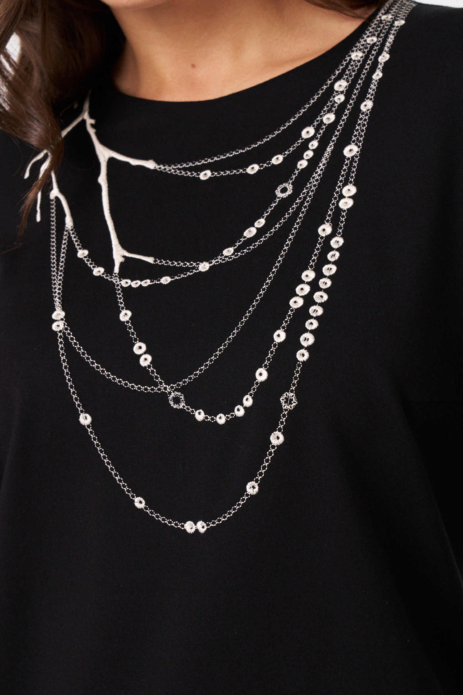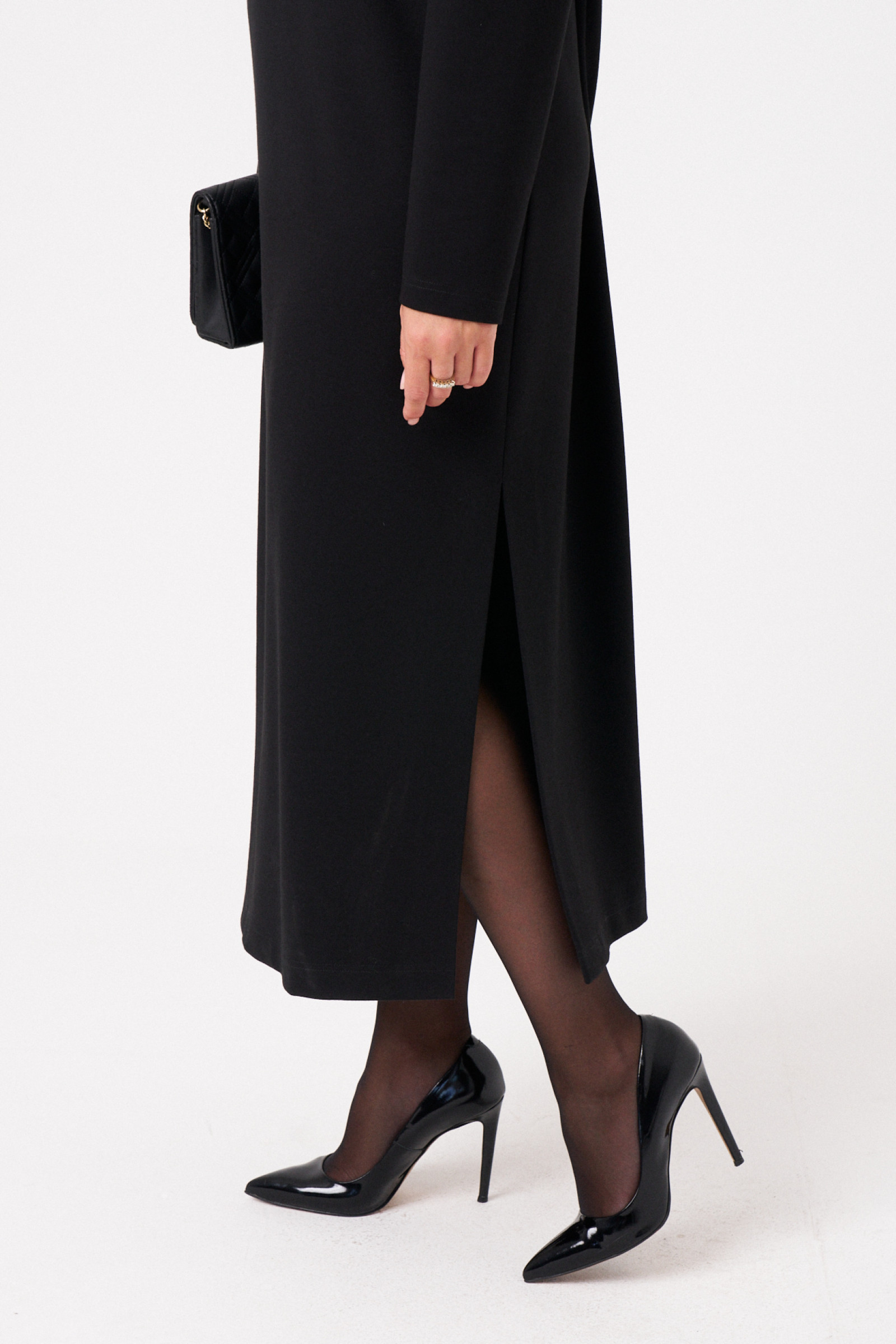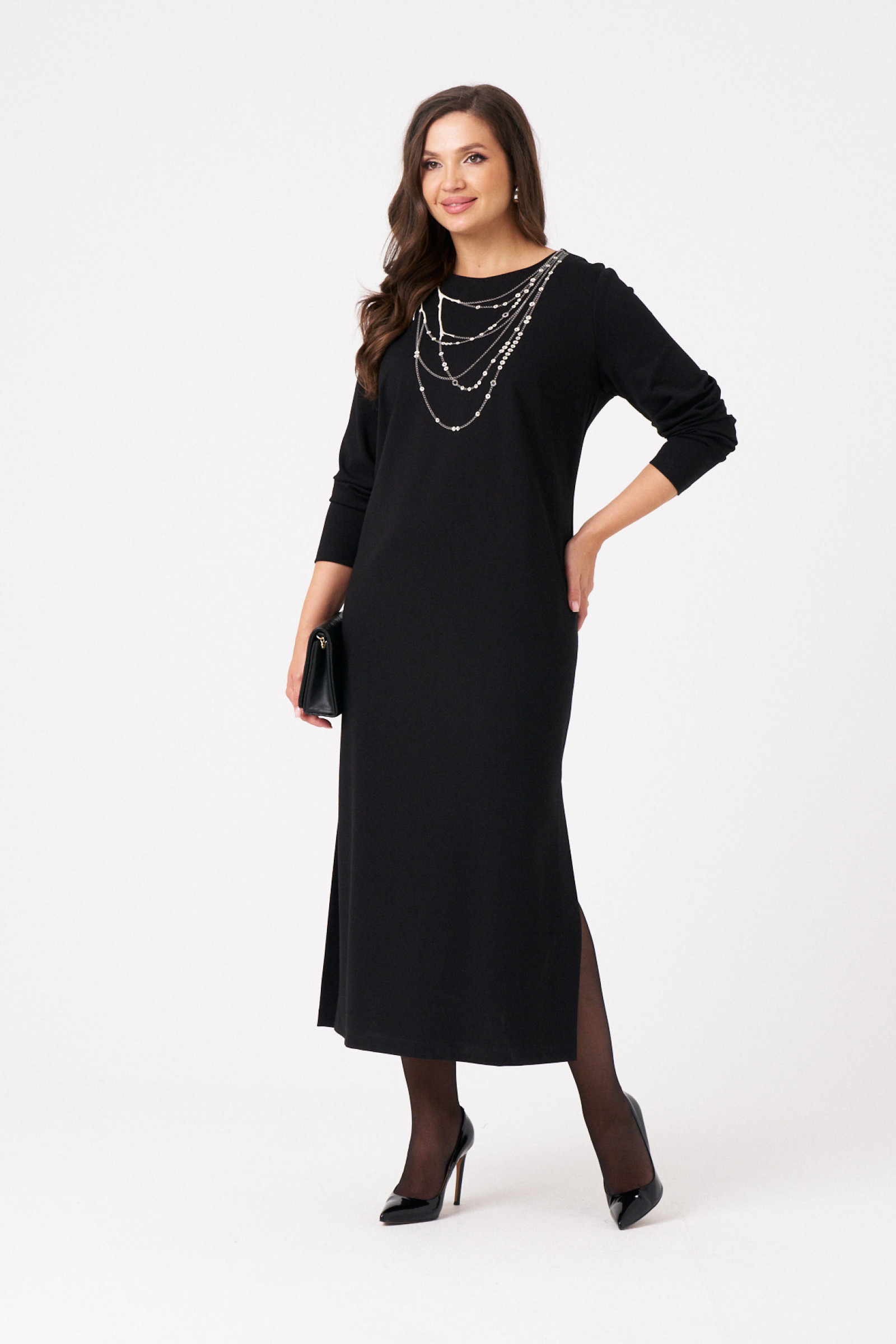 Женское платье из поливискозного трикотажного полотна сочетает комфорт и стиль. Модель выполнена с учетом современных тенденций и идеально подходит для повседневной носки. Перед украшен двумя нагрудными вытачками и дизайнерской вышивкой в виде бус, что придает образу оригинальность. Спинка со средним швом и двумя талиевыми вытачками обеспечивает аккуратную посадку, а потайная застежка-молния в среднем шве облегчает надевание. В боковых швах расположены разрезы, добавляющие легкости и свободы движений. Расширенная горловина создает эффект открытой линии декольте, а длинные втачные рукава делают модель универсальной для прохладной погоды. Это стильное и удобное платье длинной макси и отлично подойдет для повседневных образов и неформальных мероприятий.