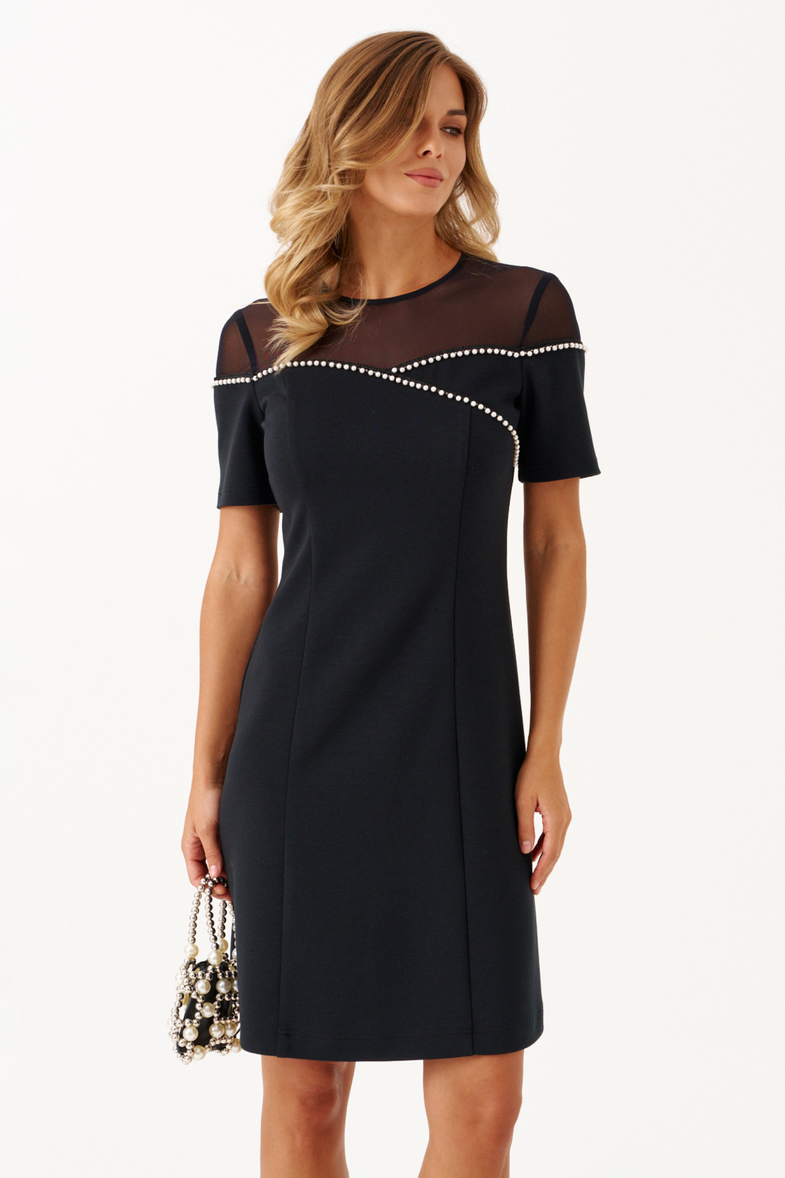Женское платье миди из трикотажного полотна, чёрного цвета. Современное платье длиной миди сочетает в себе комфорт и стиль, идеально подходит как для повседневной носки, так и для особых случаев. Модель с полуприлегающим силуэтом обеспечивает свободу движений и комфорт благодаря чуть расширенной горловине. Особенный акцент ставит фигурный шов на передней части платья, украшенный декоративной тесьмой из бусин. Верхняя часть переда выполнена из элегантной сетки, которая красиво продолжается на рукавах. Вертикальные рельефы — два на переде и два на спинке — создают визуальную динамику и придают образу расслабленность. На спинке предусмотрен средний шов со скрытой молнией и кокеткой из сетки, дополненной застежкой «капелька» на пуговицу для удобства. Рукава длиной чуть выше локтя. Это универсальное чёрное платье станет стильной и практичной обновкой в любом гардеробе.