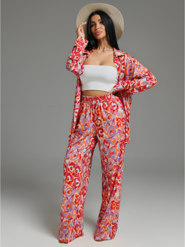 с длинным втачным рукавом с манжетой. Брюки прямые от бедра с отрезным поясом.