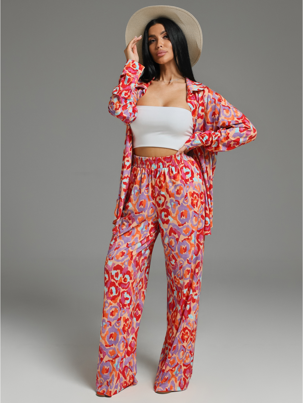 с длинным втачным рукавом с манжетой. Брюки прямые от бедра с отрезным поясом.