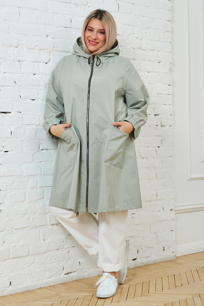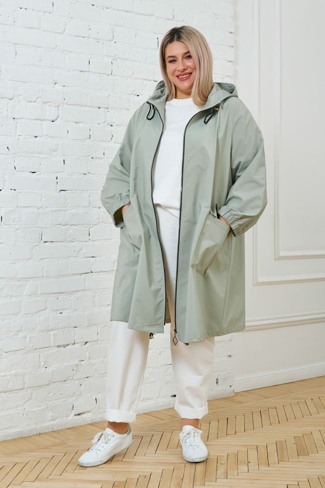 светло-зеленый Стильная парка трапециевидного силуэта из плащевой однотонной ткани без подклада. Круглый вырез горловины дополнен шлемовидным капюшоном со шнуром и фиксаторами.  По переду - центральная застежка на тесьму-молнию. Длинные втачные рукава, с широкой резиной по низу. По переду большие накладные карманы с клапанами, удобно расположенные по линии бедер. Спинка со швом по центру, оканчивающимся разрезом. Низ ровный дополнен шнуром и фиксаторами. Темп.режим от +10 до +20